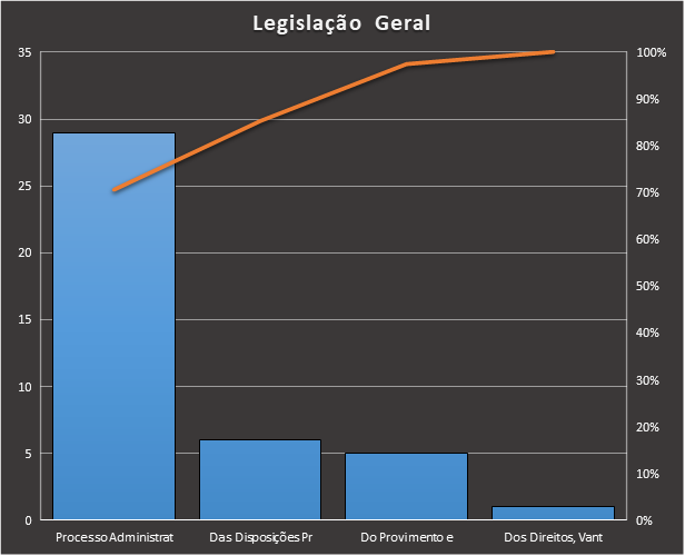 8) Legislação Geral Em Legislação Geral, nos baseamos neste caderno: https://www.tecconcursos.com.br/s/Q245BU, contendo 41 questões. Usamos como filtro questões da banca IBFC. 71% das questões são de "Processo Administrativo". Veja como ficou a distribuição.