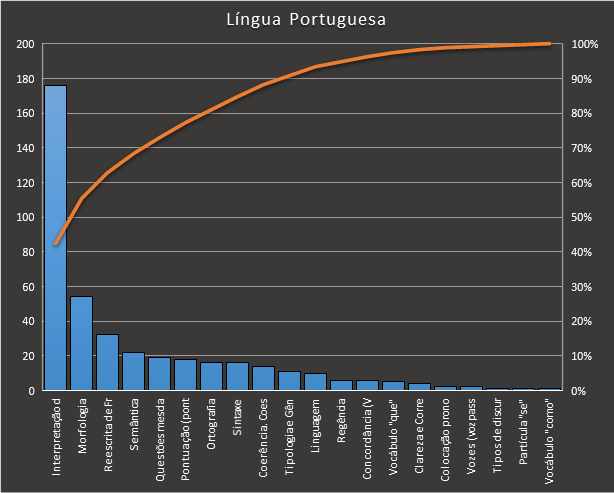 Destacados de azul nessa tabela estão 5 tópicos cuja probabilidade acumulada é de 73%. Isso significa que apenas 5 tópicos cobrem mais de 70% de todas as questões da matéria que obedecem aos filtros utilizados. O destaque vai para "interpretação de textos", que sozinho corresponde a 42% das questões. Em seguida vêm morfologia e reescrita de frases. Segue a distribuição: