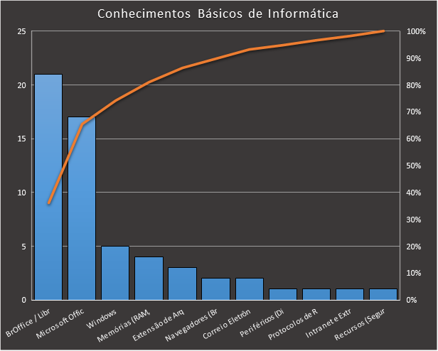 https://www.tecconcursos.com.br/s/Q1vptV, contendo 58 questões. Usamos como filtro questões da banca FGV para a área policial. Veja como ficou a distribuição, com BrOffice/LibreOffice e Microsoft Office sendo os tópicos mais cobrados.