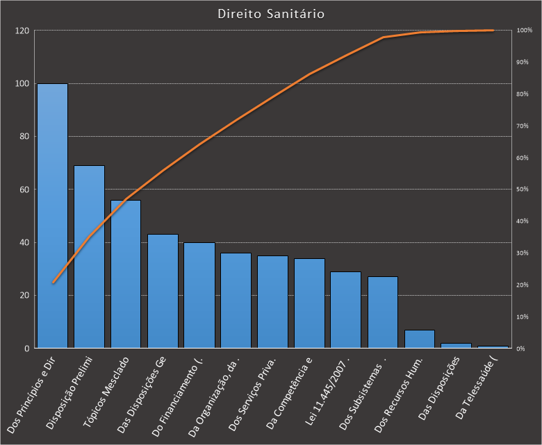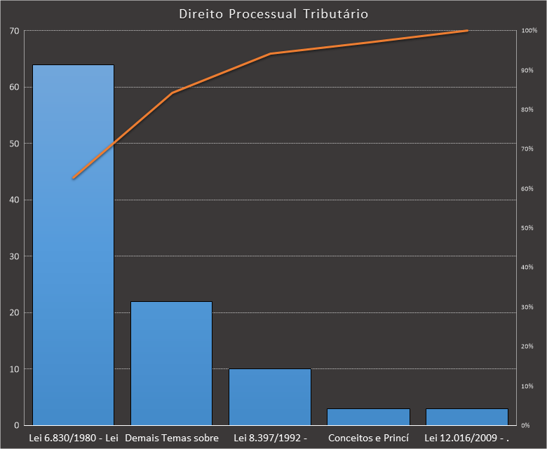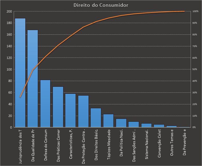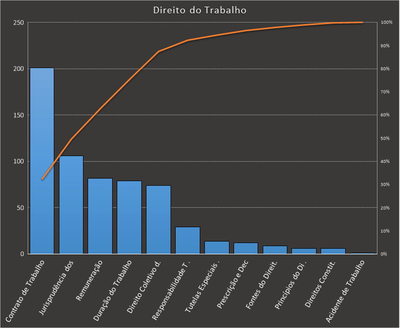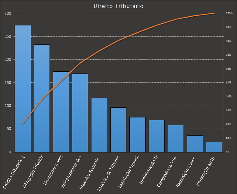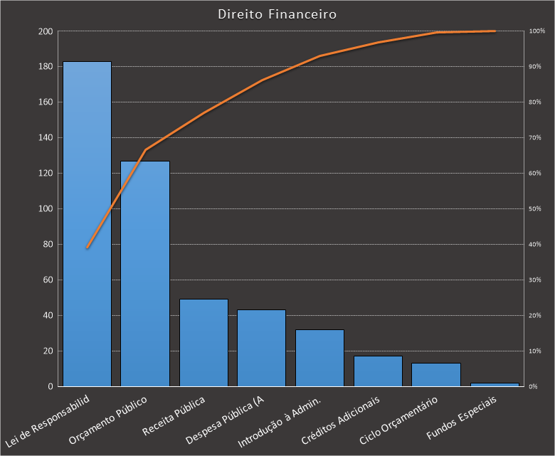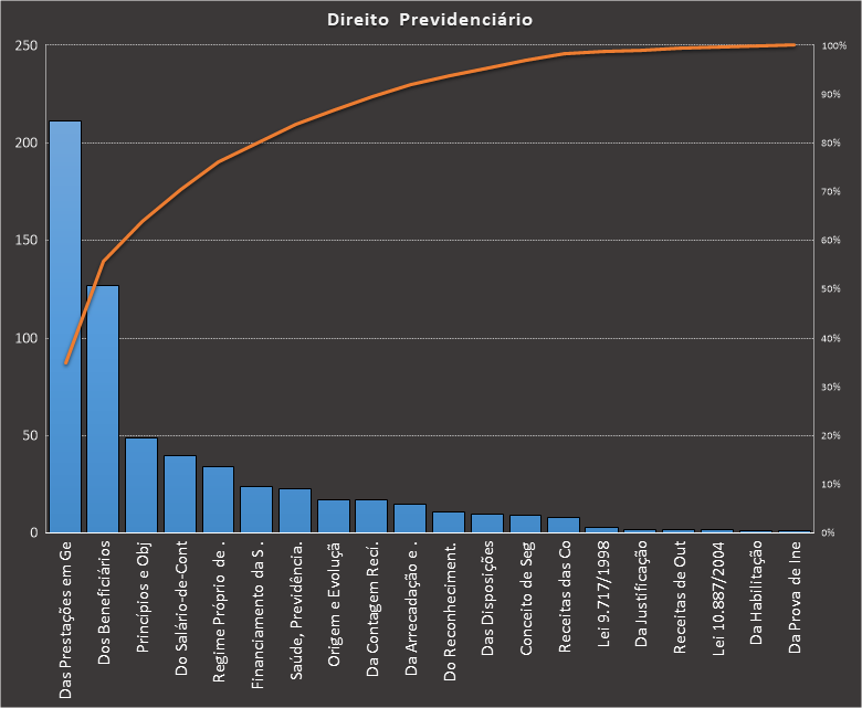 Para esta matéria em específico, temos destacados de azul 4 tópicos cuja porcentagem acumulada é de 76%. Isso significa que apenas 4 assuntos cobrem 76% de todas as questões da matéria que obedecem aos filtros utilizados. Segue a distribuição.