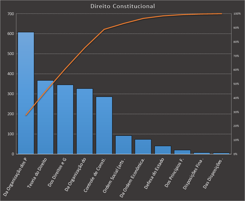 Em Direito Constitucional, nos baseamos neste caderno, contendo 2.173 questões. Usamos como filtro questões elaboradas pela banca CEBRASPE em concursos para autoridades da área jurídica. O resultado está na tabela abaixo. Em todas as tabelas deste artigo destacamos de cor azul os assuntos que atingem porcentagem acumulada de 70%.