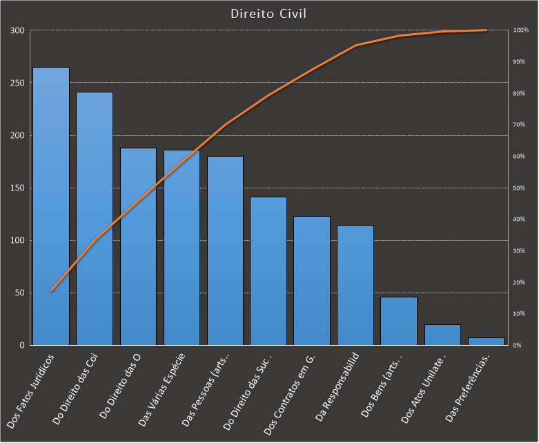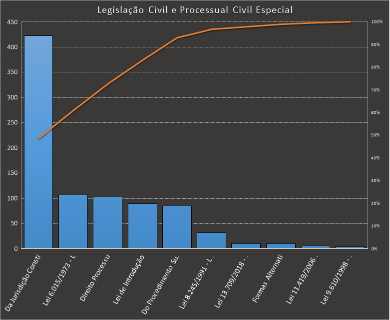 Em Legislação Civil e Processual Civil Especial, nos baseamos neste caderno, contendo 866 questões. Usamos como filtro questões elaboradas pela banca CEBRASPE em concursos para autoridades da área jurídica. Veja como ficou a distribuição.