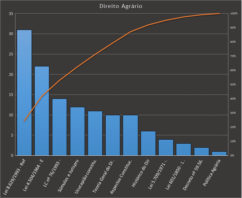 Para Direito Agrário, nos baseamos neste caderno, contendo 126 questões. Usamos como filtro questões elaboradas pela banca CEBRASPE em concursos para autoridades da área jurídica. Veja o resultado.