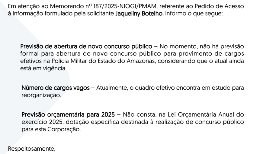 No momento, não há nenhuma previsão de um novo concurso da PM AM. Ao menos é o que informa o órgão, que acrescentou que o último certame ainda está em vigência.