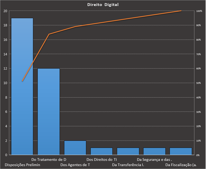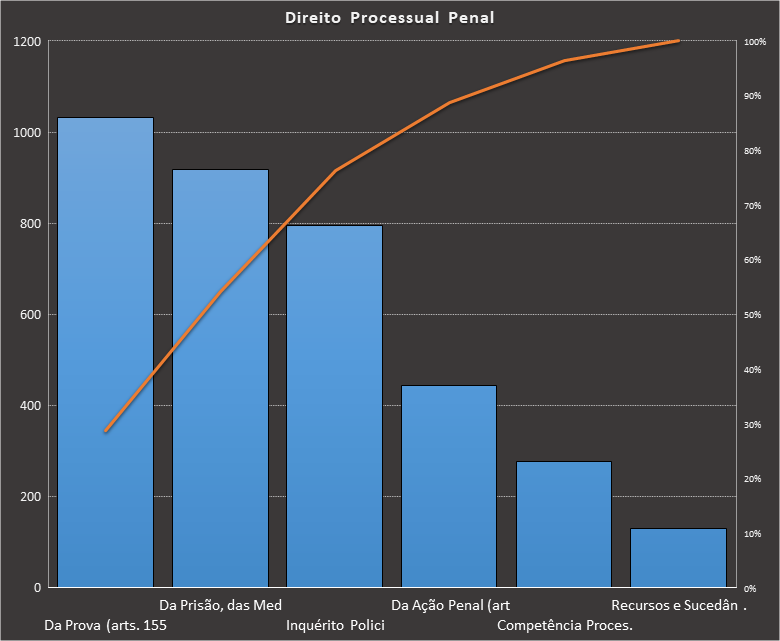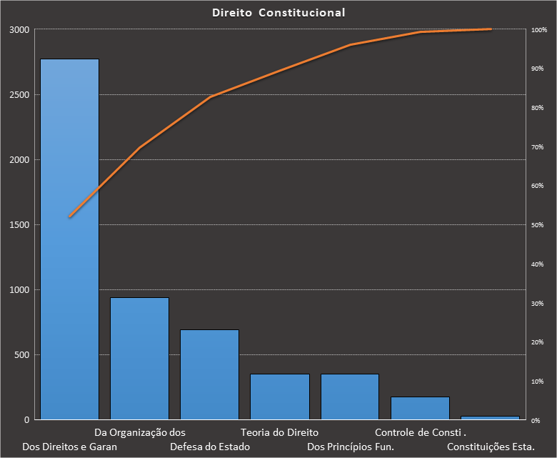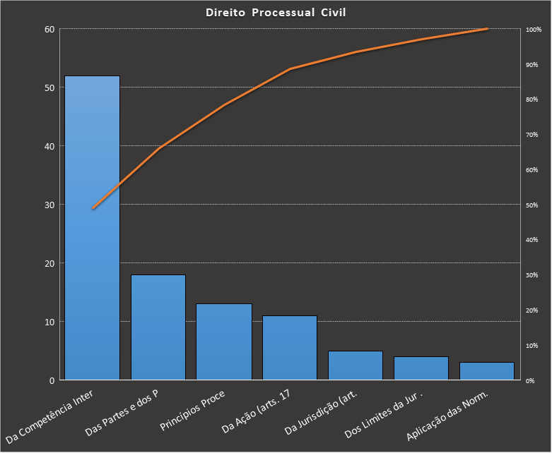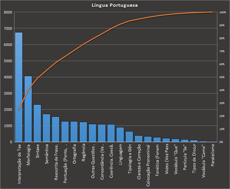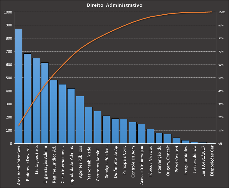 Em todas as tabelas deste artigo destacamos de cor azul os assuntos que atingem porcentagem acumulada de 70%. Para esta matéria em específico, temos destacados de azul 7 tópicos cuja porcentagem acumulada é de 71%. Isso significa que apenas 7 assuntos cobrem 71% de todas as questões da matéria que obedecem aos filtros utilizados. Segue a distribuição.