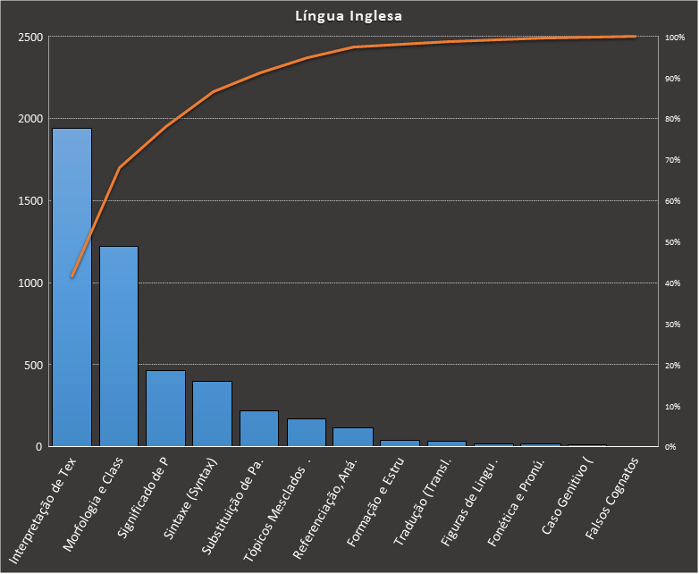 Em Língua Inglesa, nos baseamos neste caderno, contendo 4.647 questões. Usamos como filtros questões de concursos das forças armadas e da área policial. A distribuição a seguir mostra a importância que as bancas dão para Interpretação de Textos em concursos para forças armadas e para a área policial. Ao priorizar esse assunto nos estudos, estará se preparando para 42% das questões de Língua Inglesa. Veja como ficou a distribuição.