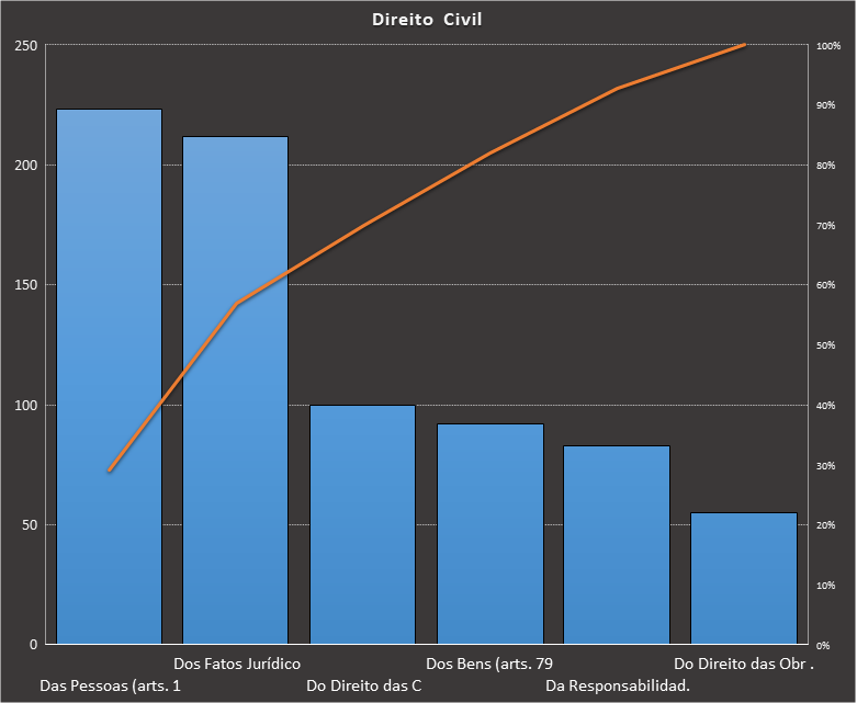 Em Direito Civil, nos baseamos neste caderno, contendo 765 questões. Usamos como filtros questões de concursos das forças armadas e da área policial. Veja como ficou a distribuição.