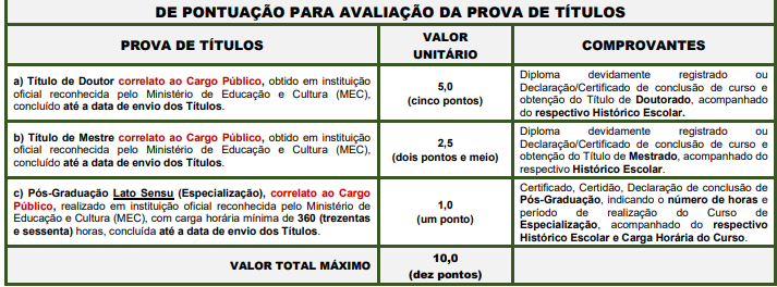 Para os cargos de Analista de Negócios, Analista de Sistemas, Engenheiro de Telecomunicações e Auditor Municipal de Controle Interno haverá a avaliação de títulos, conforme as tabelas abaixo: