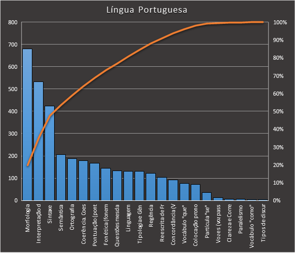 Destacados de azul nessa tabela estão 8 tópicos cuja probabilidade acumulada é de 73%. Isso significa que apenas 8 tópicos cobrem 73% de todas as questões da matéria que obedecem aos filtros utilizados. Morfologia foi o tópico mais cobrado pela banca, seguidos dos tópicos "interpretação de textos" e "sintaxe". Veja a distribuição: