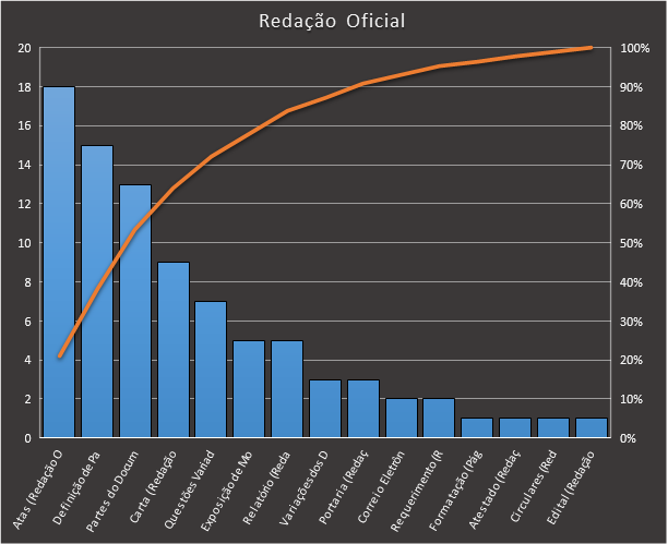 https://www.tecconcursos.com.br/s/Q1xwqF, contendo 86 questões. Usamos como filtro questões da bancas "AOCP" e "Instituto AOCP". Veja como ficou a distribuição. "Atas", "definição de padrão ofício" e "partes do documento" correspondem a mais da metade das questões.
