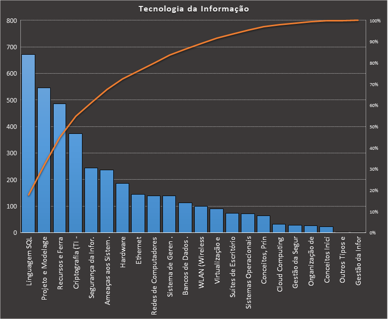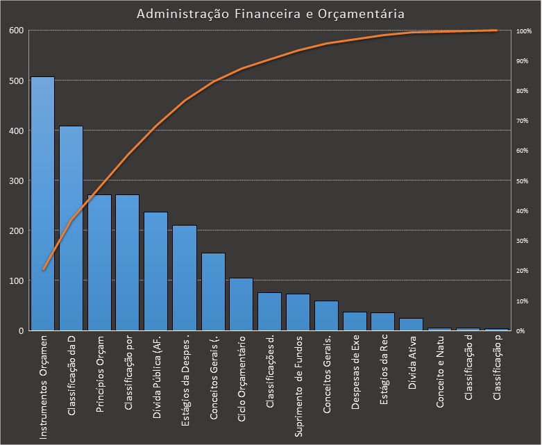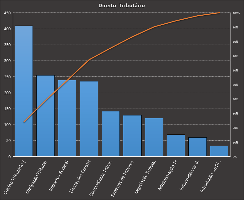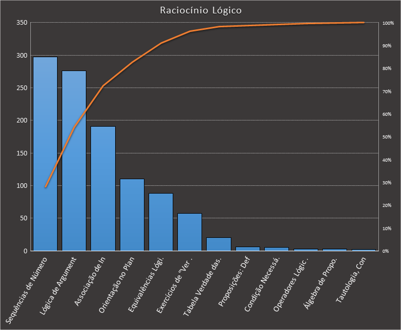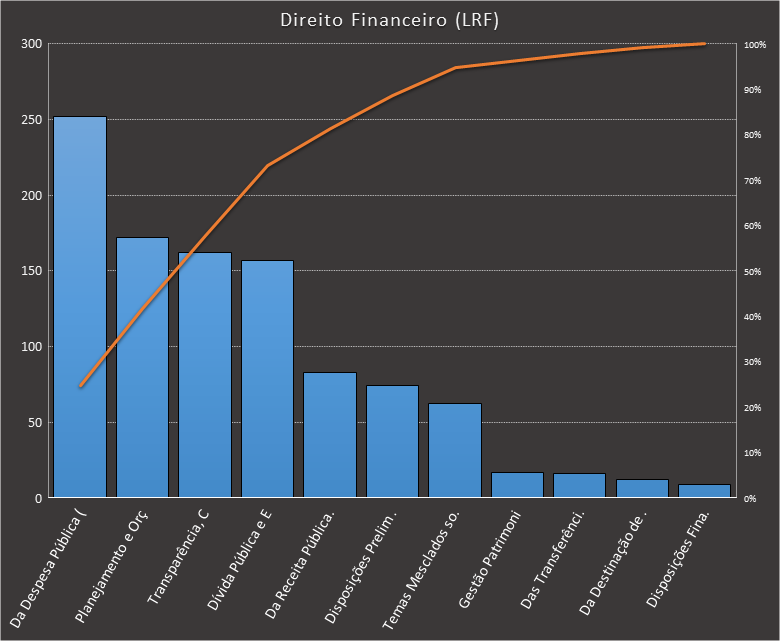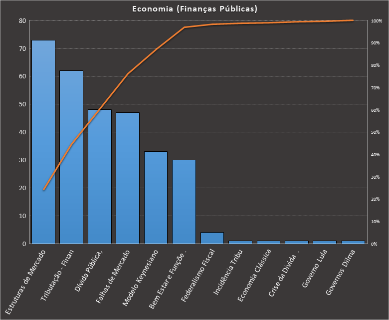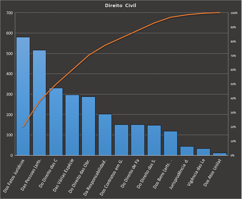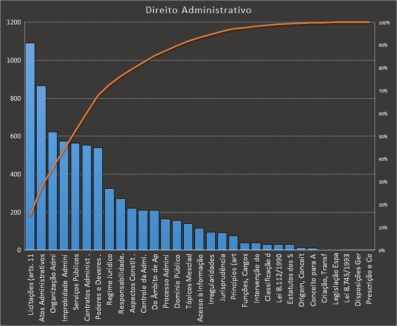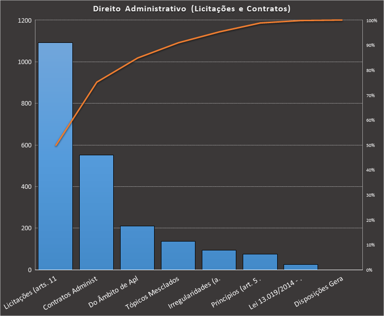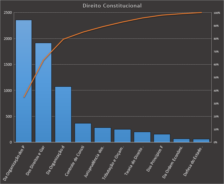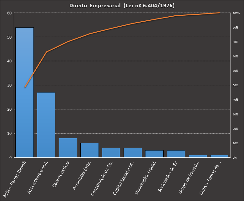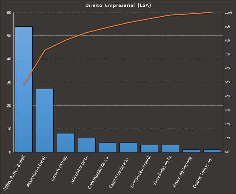 Em todas as tabelas deste artigo destacamos de cor azul os assuntos que atingem porcentagem acumulada de 70%. Para esta matéria em específico, temos destacados de azul 6 tópicos cuja porcentagem acumulada é de 71%. Isso significa que apenas 6 assuntos cobrem 71% de todas as questões da matéria que obedecem aos filtros utilizados. Segue a distribuição.
