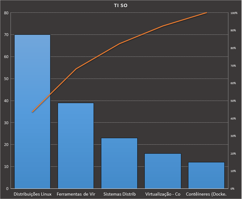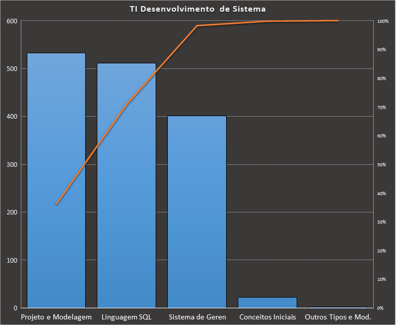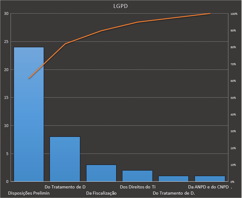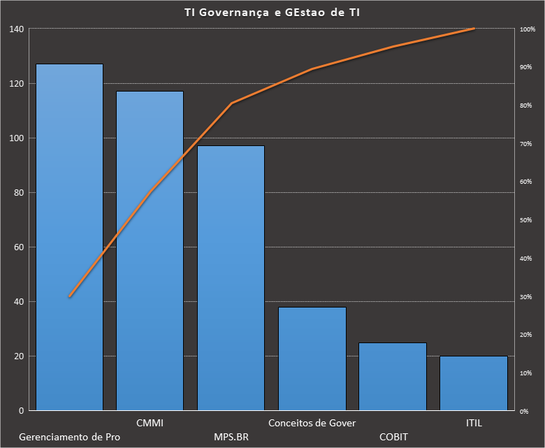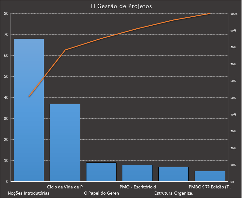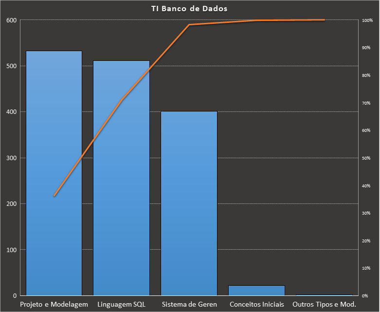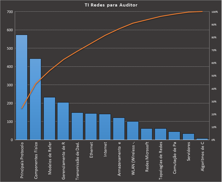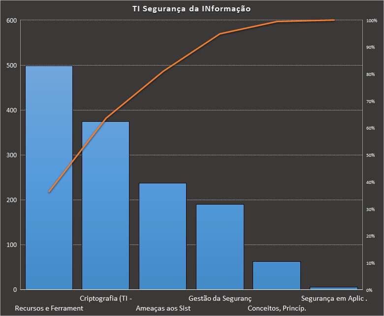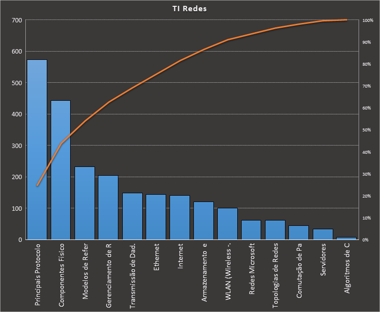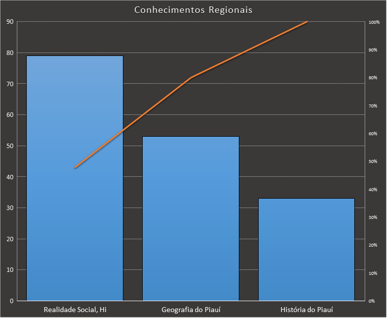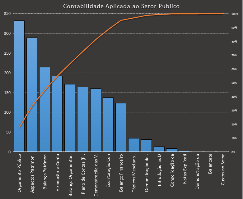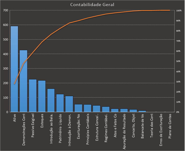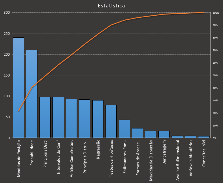 Em todas as tabelas deste artigo destacamos de cor azul os assuntos que atingem porcentagem acumulada de 70%. Para esta matéria em específico, temos destacados de azul 6 tópicos cuja porcentagem acumulada é de 71%. Isso significa que apenas 6 assuntos cobrem 71% de todas as questões da matéria que obedecem aos filtros utilizados. Segue a distribuição.