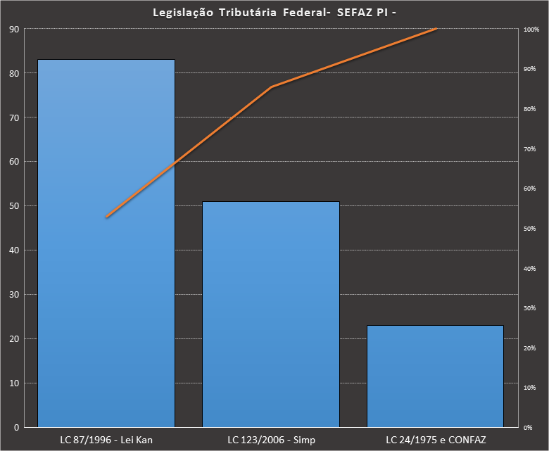 Em Legislação Tributária Federal, nos baseamos neste caderno, contendo 157 questões. Usamos como filtros questões elaboradas pela FCC. Veja como ficou a distribuição.