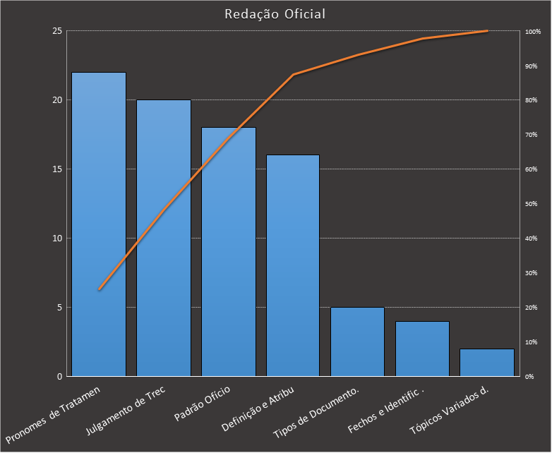 Em Redação Oficial, nos baseamos neste caderno, contendo 87 questões. Usamos como filtros questões elaboradas pela FCC. Veja abaixo que um quarto de todas as questões cobra pronomes de tratamento, e que esse assunto somado com "julgamento de trechos quanto à correção" abarcam aproximadamente metade das questões.