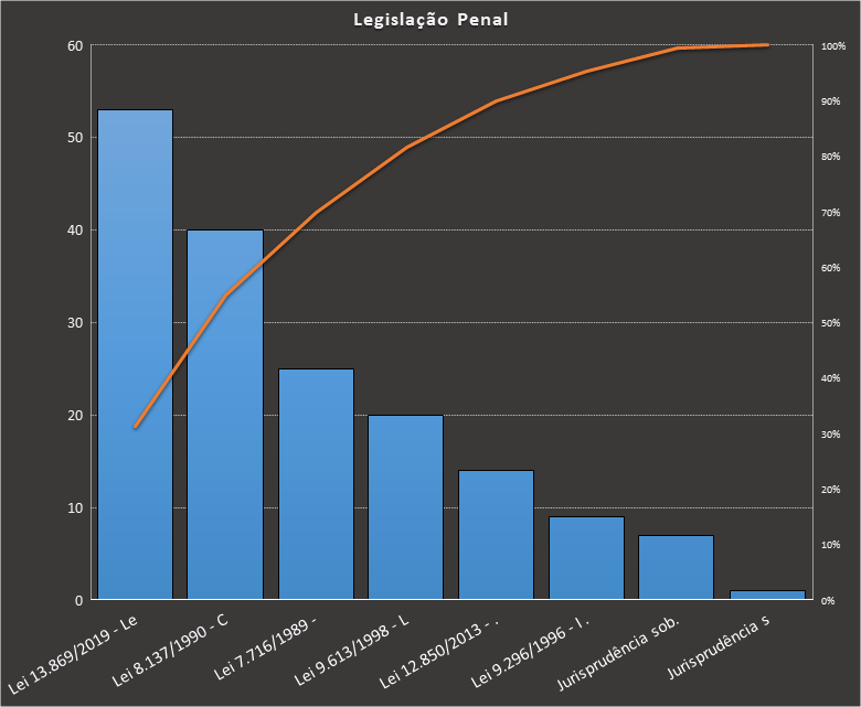 Em Legislação Penal, nos baseamos neste caderno, contendo 169 questões. Usamos como filtros questões elaboradas pela FCC. Veja como ficou a distribuição.