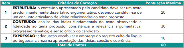 A prova discursiva será realizada no mesmo dia e horário da prova objetiva e será composta de uma questão de conhecimento específico. Para o desenvolvimento da prova discursiva, o candidato deverá redigir no mínimo 20 e no máximo 40 linhas, observando os critérios de correção do quadro a seguir:
