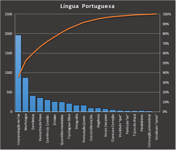 Destacados de azul nessa tabela estão 5 tópicos cuja probabilidade acumulada é de 72%. Isso significa que apenas 5 tópicos cobrem 72% de todas as questões da matéria que obedecem aos filtros utilizados. Dois desses tópicos sozinhos abarcamos mais da metade das questões, são eles "interpretação de textos" e "morfologia". Veja o resultado:
