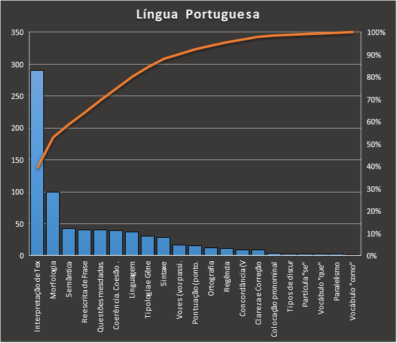 1. CONHECIMENTOS BÁSICOS 1) Língua Portuguesa Em Língua Portuguesa, nos baseamos neste caderno: https://www.tecconcursos.com.br/s/Q27Vkg, contendo 733 questões. Usamos como filtro questões de ensino superior da banca FGV de para área judiciária. O resultado está na tabela abaixo. Destacados de azul nessa tabela estão 5 tópicos cuja porcentagem acumulada é de 70%. Isso significa que apenas 5 tópicos cobrem 70% de todas as questões da matéria que obedecem aos filtros utilizados. O tópico mais cobrado é Interpretação de textos, que abrange 40% das questões. Segue a distribuição: