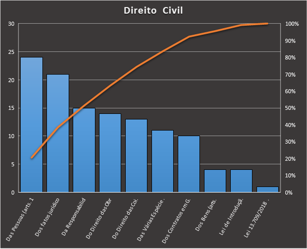 4) Direito Civil Para esta matéria nos baseamos neste caderno: https://www.tecconcursos.com.br/s/Q27Vkj, contendo 117 questões. Usamos como filtro questões de ensino superior da banca FGV de para área judiciária, resultando na seguinte distribuição: