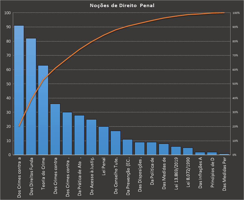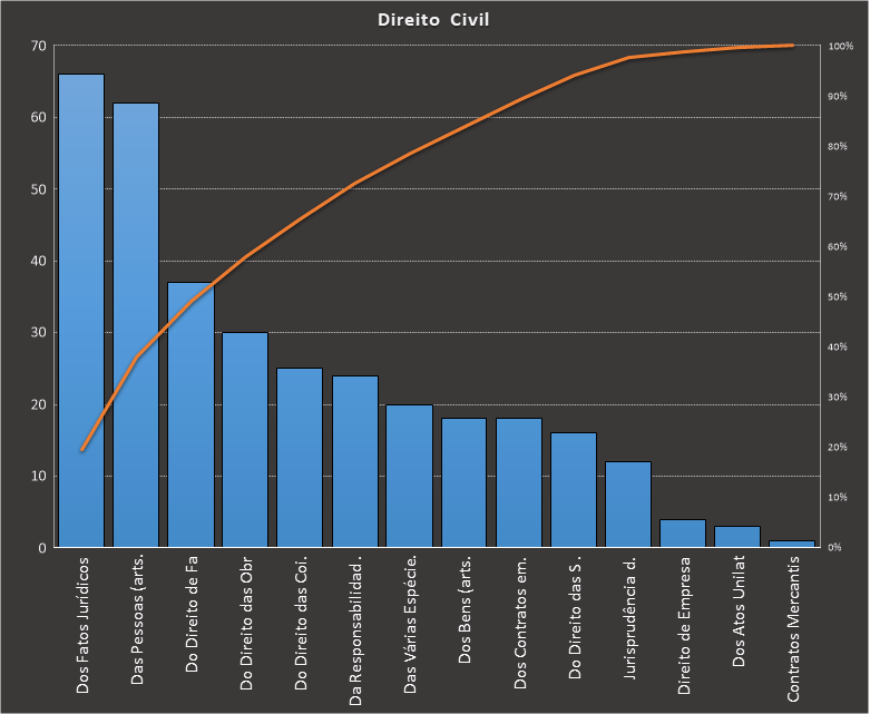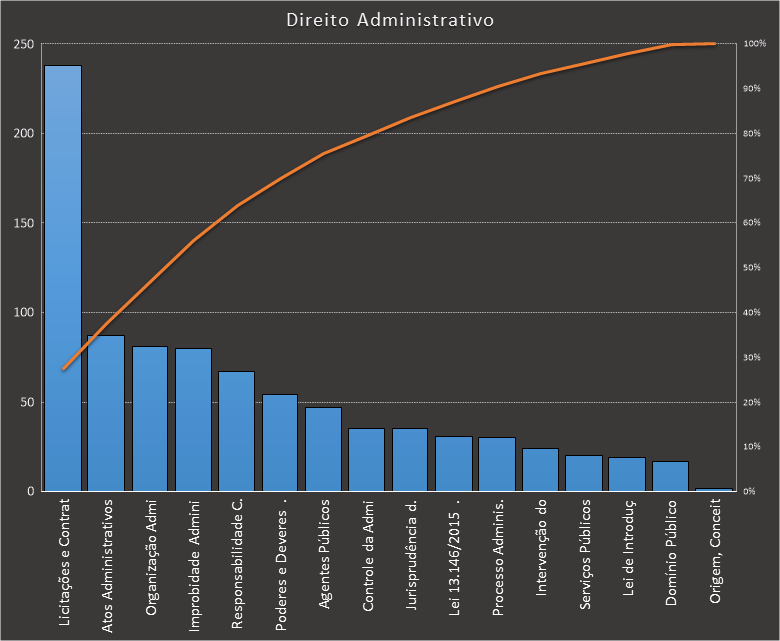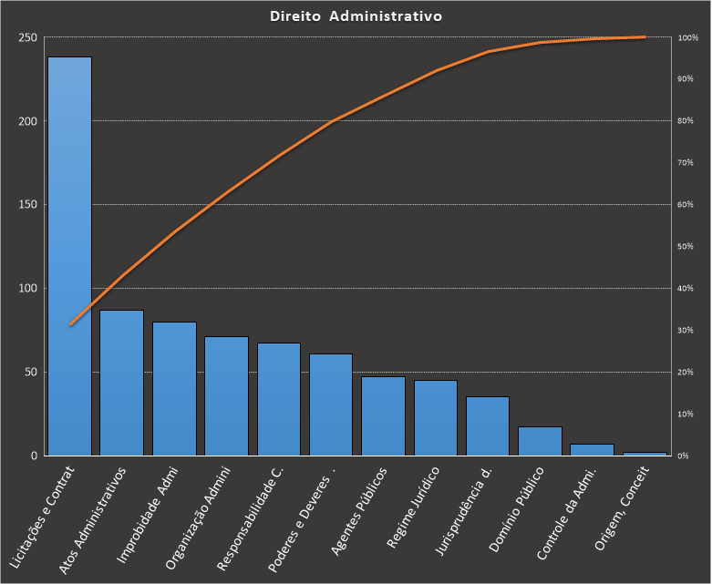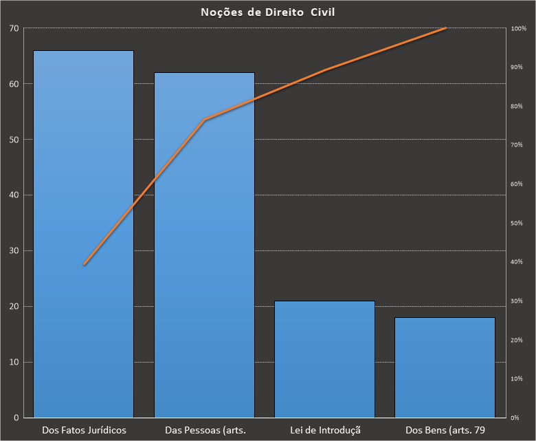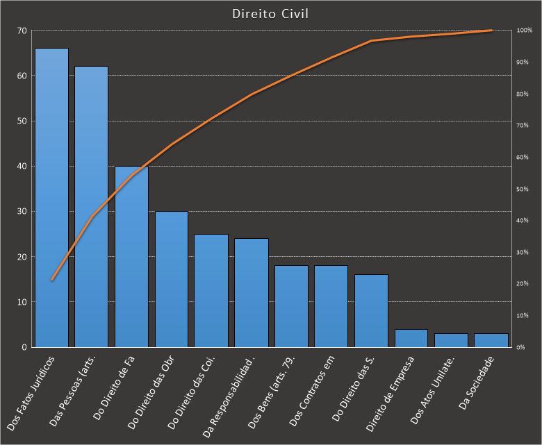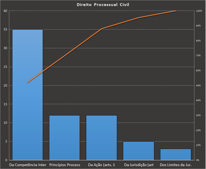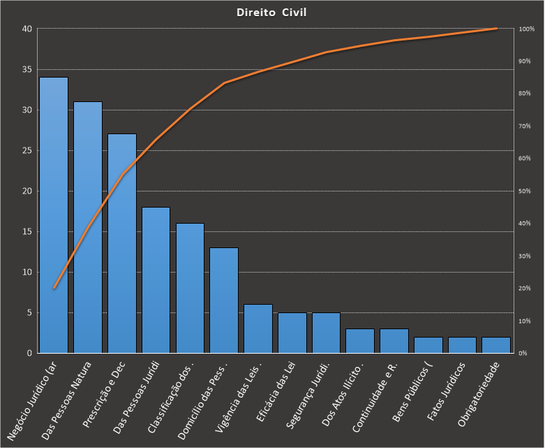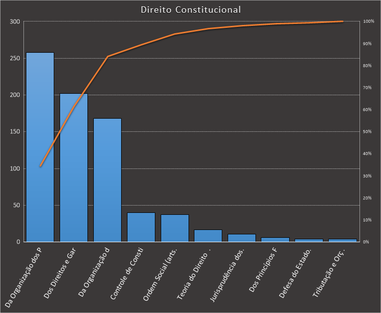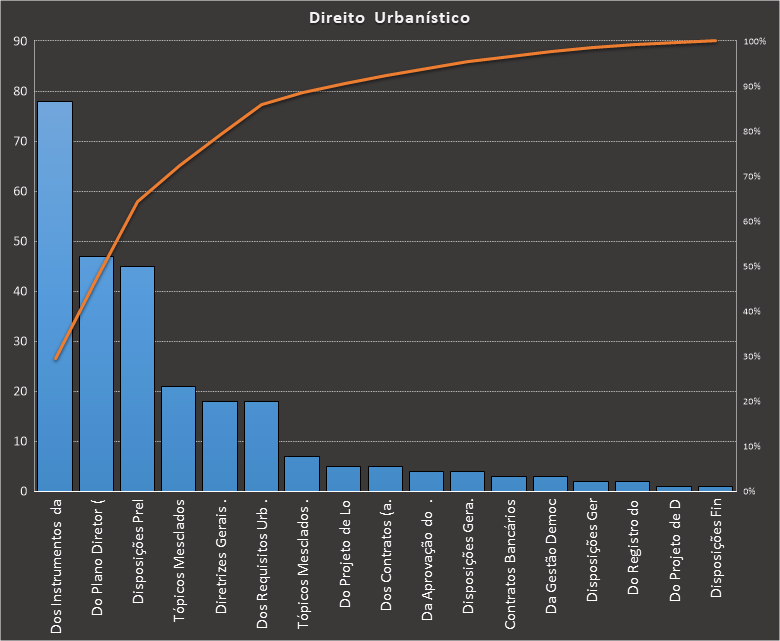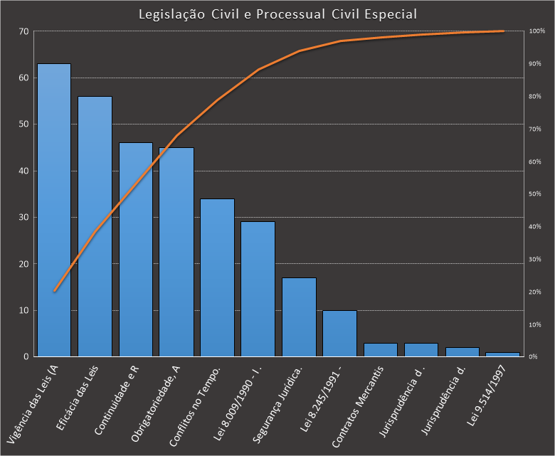 Em todas as tabelas deste artigo destacamos de cor azul os assuntos que atingem porcentagem acumulada de 70%. Para esta matéria em específico, temos destacados de azul 5 tópicos cuja porcentagem acumulada é de 71%. Isso significa que apenas 5 assuntos cobrem 71% de todas as questões da matéria que obedecem aos filtros utilizados. Segue a distribuição.