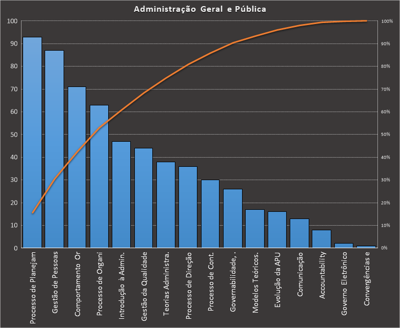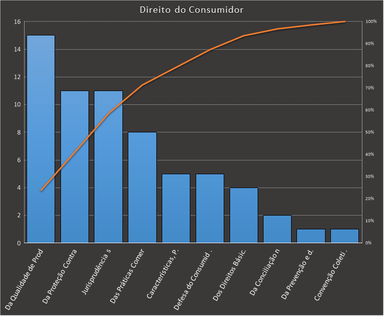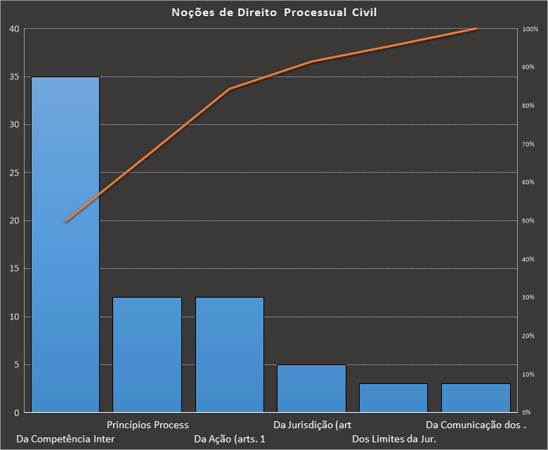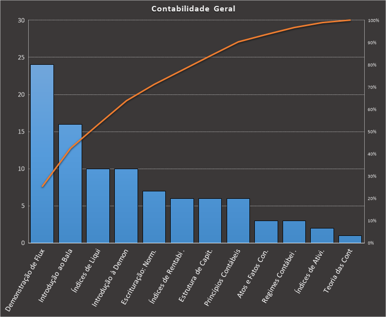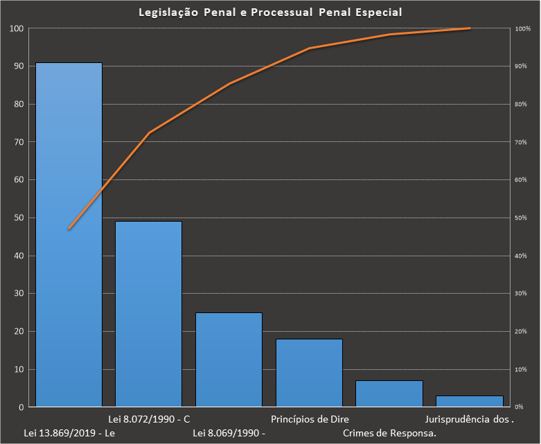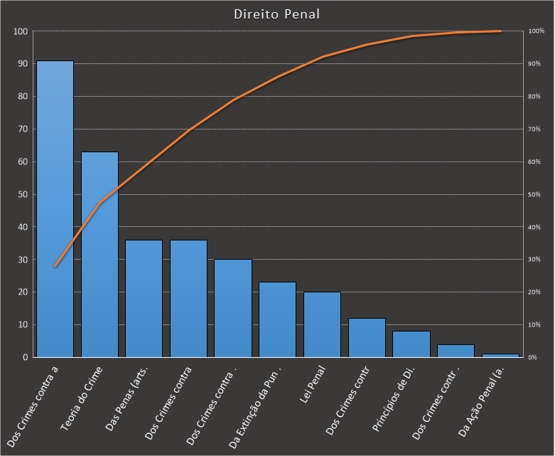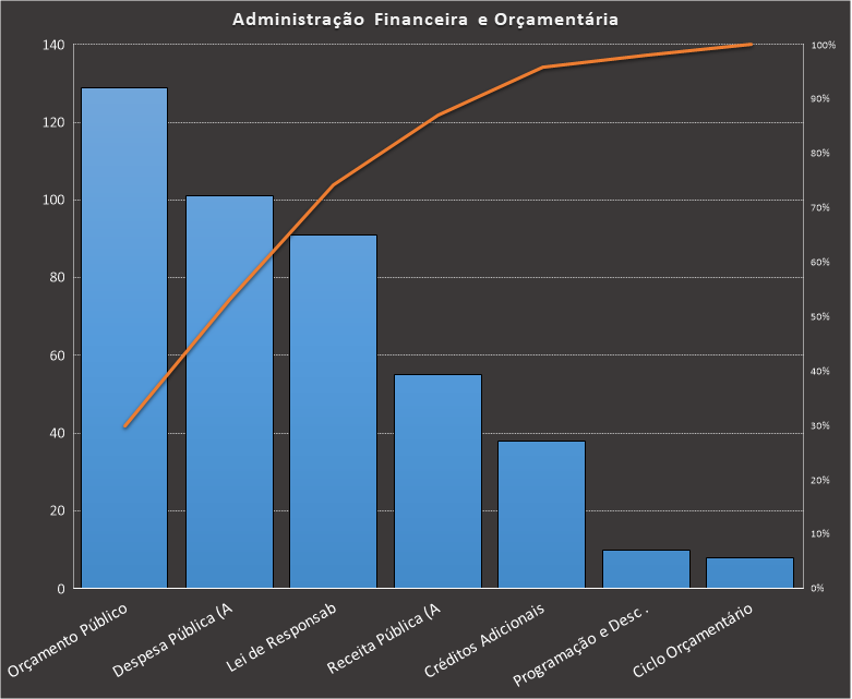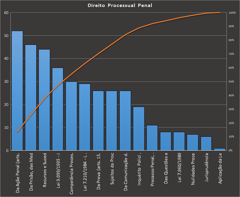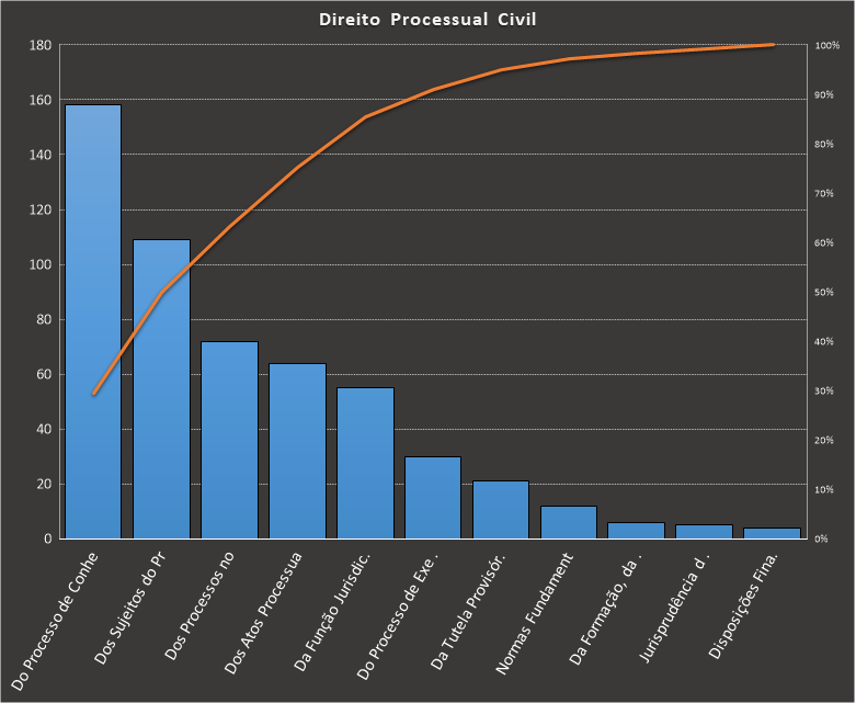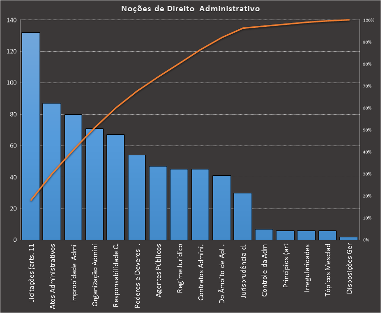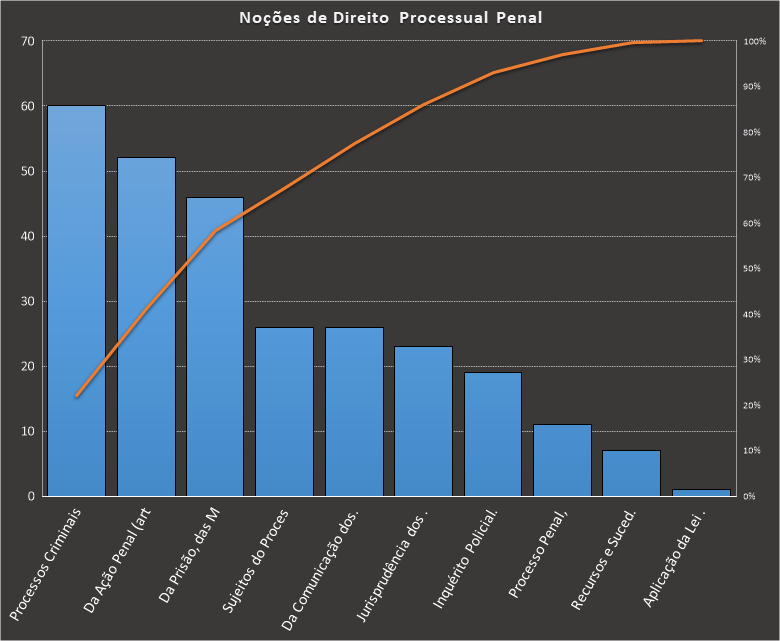 Em todas as tabelas deste artigo destacamos de cor azul os assuntos que atingem porcentagem acumulada de 70%. Para esta matéria em específico, temos destacados de azul 5 tópicos cuja porcentagem acumulada é de 71%. Isso significa que apenas 5 assuntos cobrem 71% de todas as questões da matéria que obedecem aos filtros utilizados. Segue a distribuição.