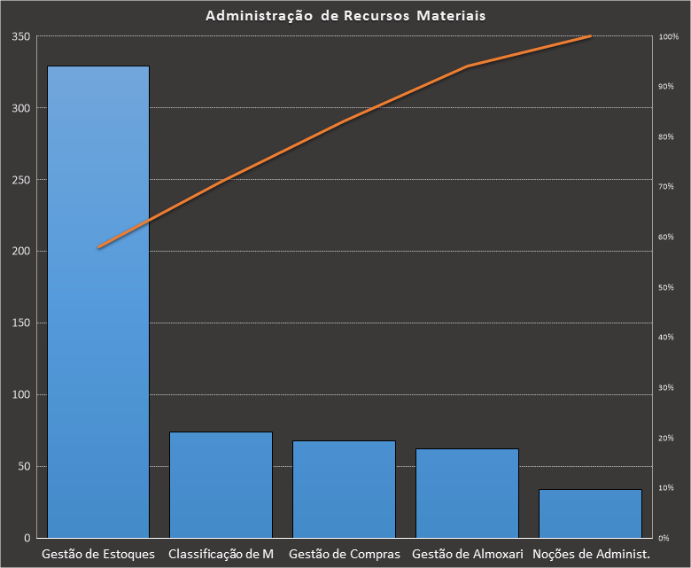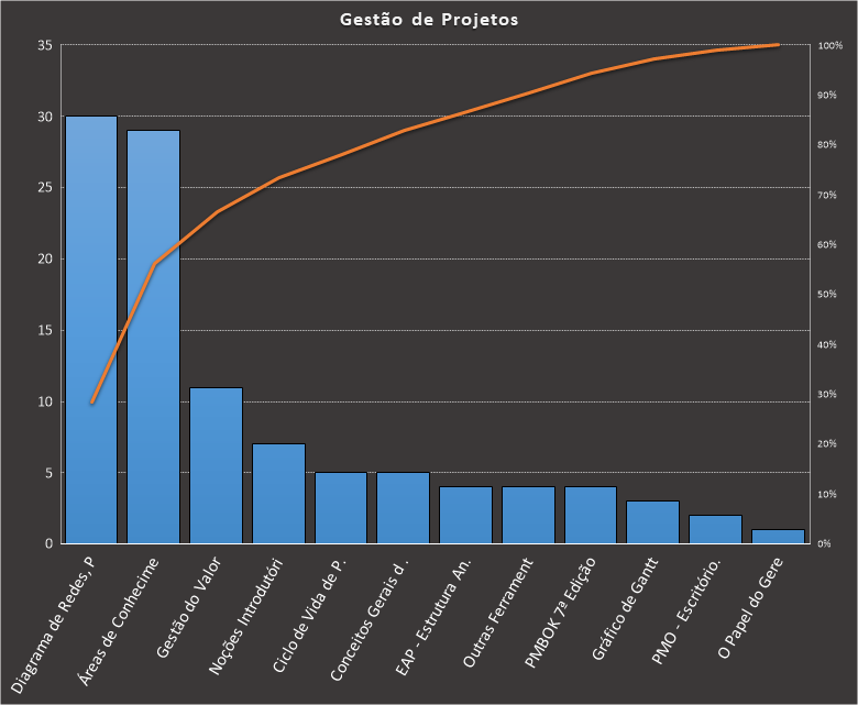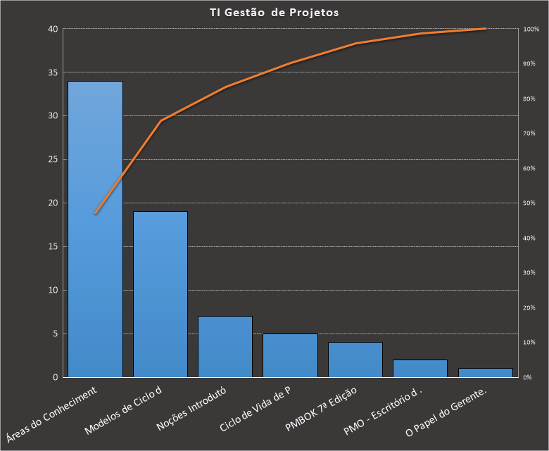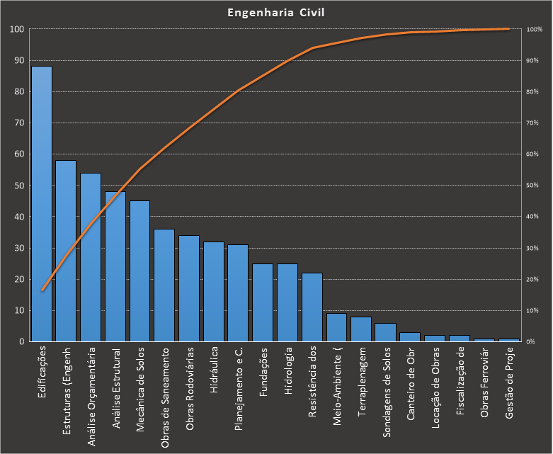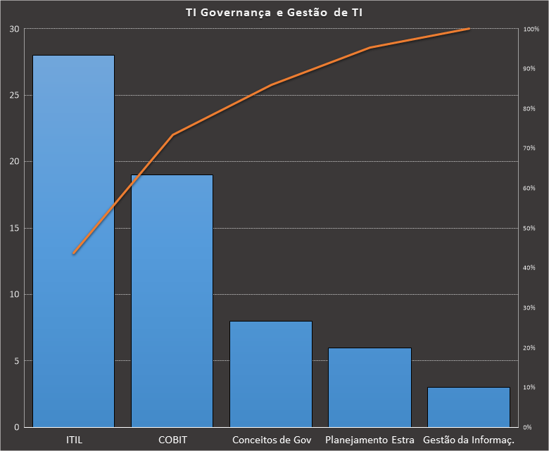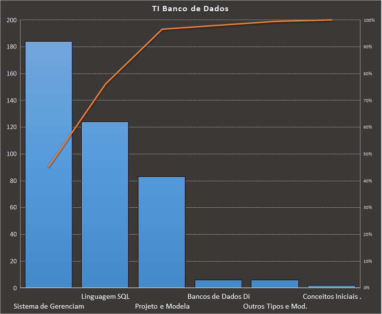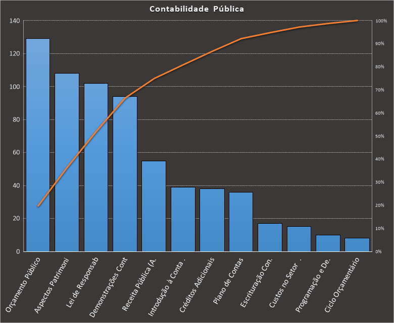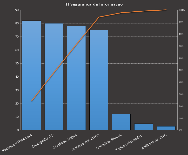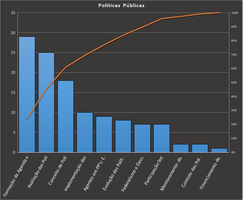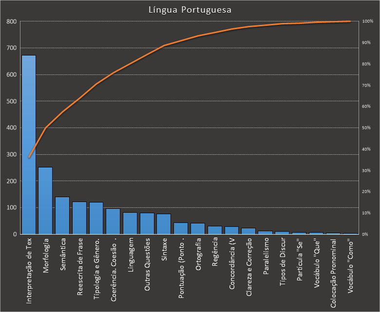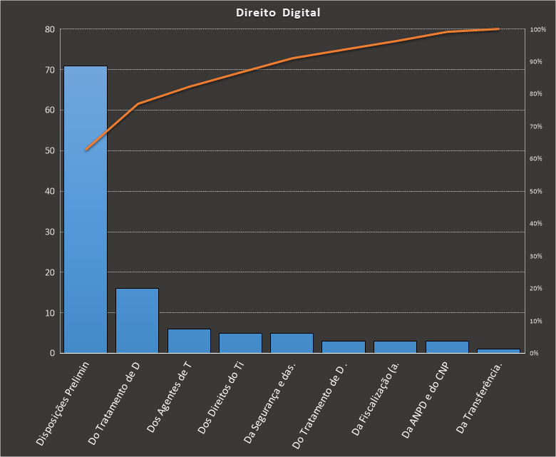 Em todas as tabelas deste artigo destacamos de cor azul os assuntos que atingem porcentagem acumulada de 70%. Para esta matéria em específico, temos destacados de azul 5 tópicos cuja porcentagem acumulada é de 71%. Isso significa que apenas 5 assuntos cobrem 71% de todas as questões da matéria que obedecem aos filtros utilizados. Segue a distribuição.