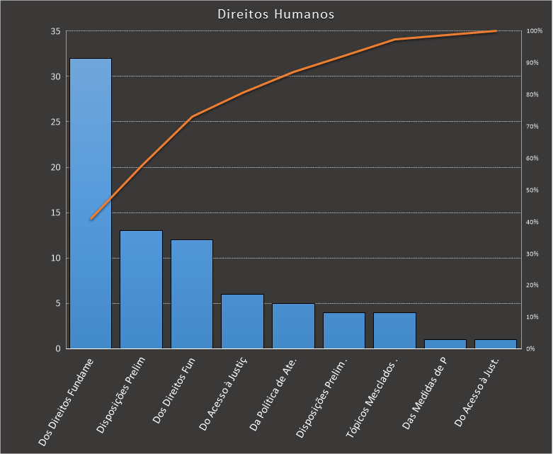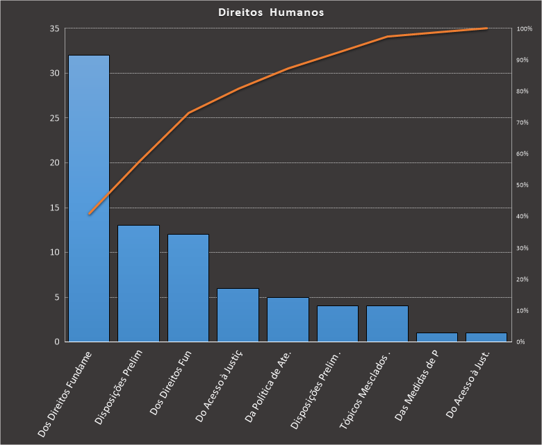 Em Direitos Humanos, nos baseamos neste caderno, contendo 78 questões. Usamos como filtros questões de concursos para servidores da área judiciária elaboradas pela banca FGV. Veja como ficou a distribuição.