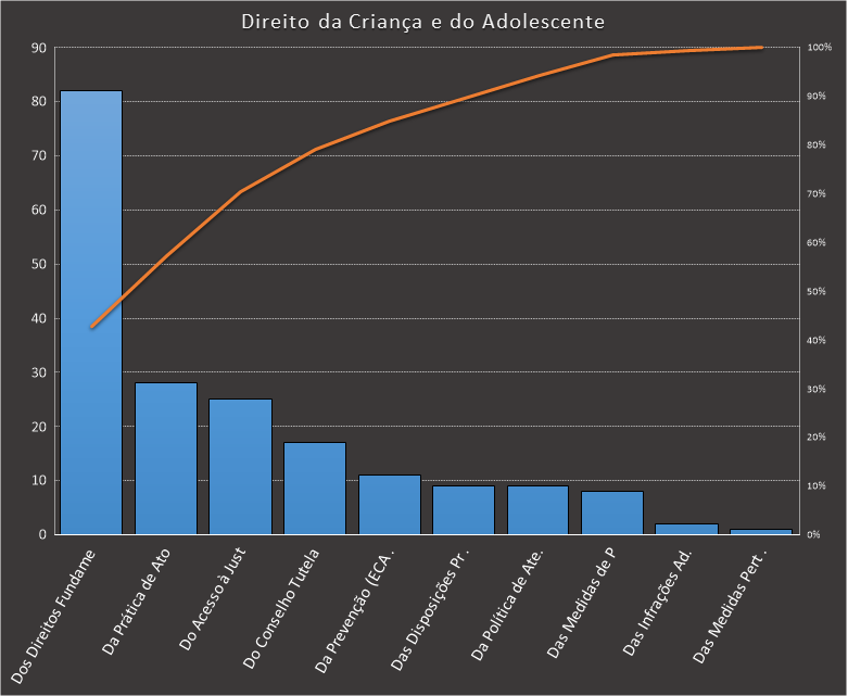 Em Direito da Criança e do Adolescente, nos baseamos neste caderno, contendo 192 questões. Usamos como filtros questões de concursos para servidores da área judiciária elaboradas pela banca FGV. Veja como ficou a distribuição.