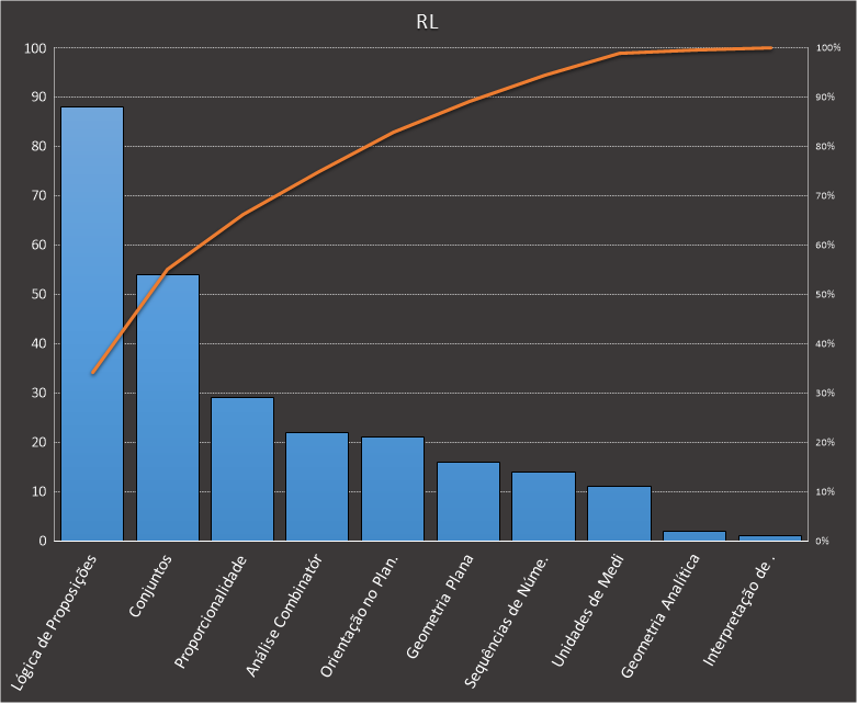 Em RL , nos baseamos neste caderno, contendo 258 questões. Usamos como filtros questões de concursos para servidores da área judiciária elaboradas pela banca FGV. Veja como ficou a distribuição.