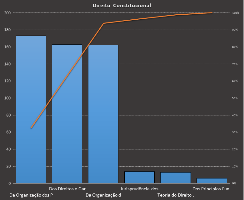 Para Direito Constitucional, nos baseamos neste caderno, contendo 747 questões. Com 35% das questões, "Organização dos Poderes" é o tema mais recorrente e demanda atenção especial nos estudos, sobretudo no seu subtópico "Poder Judiciário". Veja o resultado.