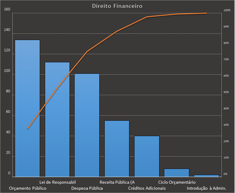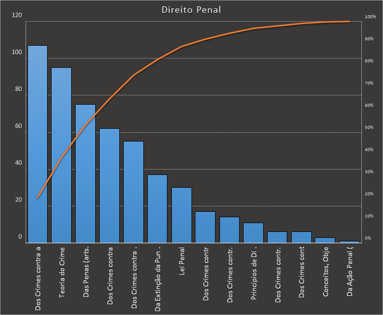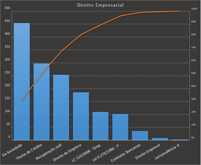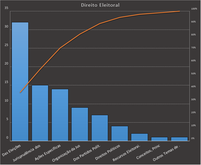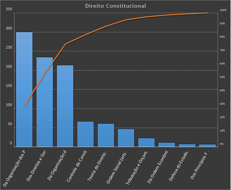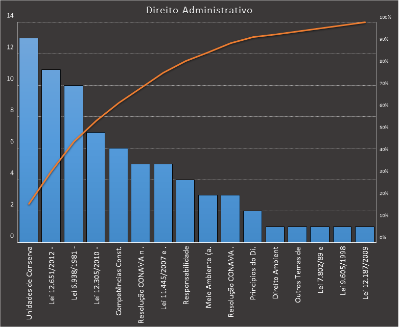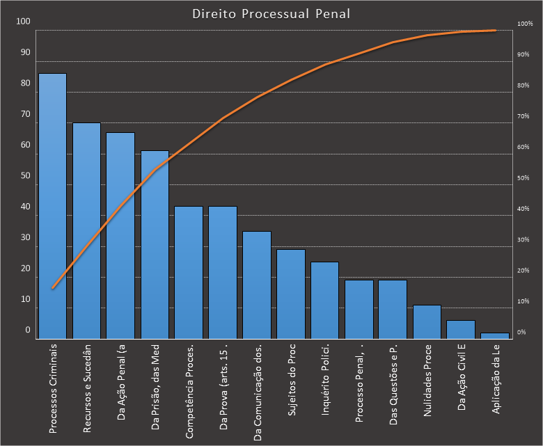 Em todas as tabelas deste artigo destacamos de cor azul os assuntos que atingem porcentagem acumulada de 70%. Para esta matéria em específico, temos destacados de azul 6 tópicos cuja porcentagem acumulada é de 75%. Isso significa que apenas 6 assuntos cobrem 75% de todas as questões da matéria que obedecem aos filtros utilizados. Segue a distribuição.