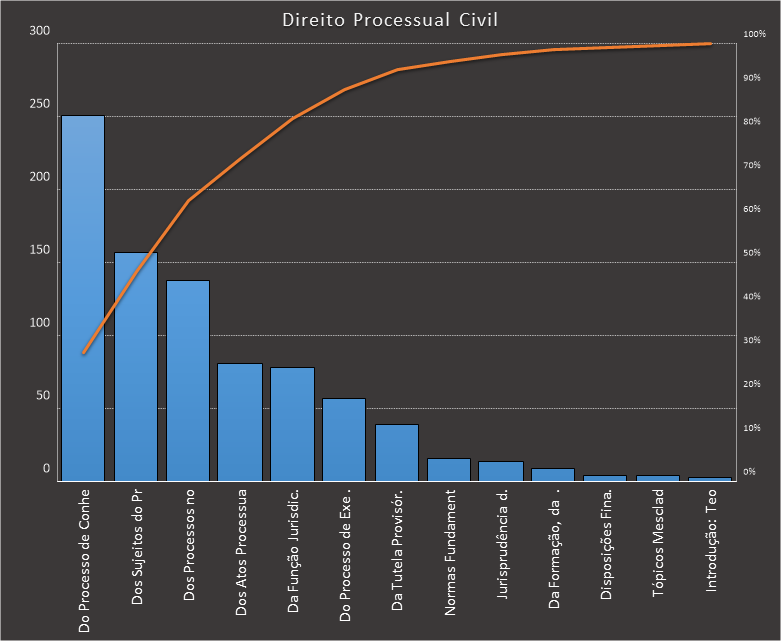 Em Direito Processual Civil, nos baseamos neste caderno, contendo 851 questões. Usamos como filtro questões elaboradas pela FGV em concursos para autoridades da área jurídica e servidores da área judiciária. Veja abaixo que dois assuntos somam 48% das questões. Ou seja, praticamente metade das questões cobram apenas dois tópicos: processo de conhecimento e cumprimento da sentença, e sujeitos do processo.