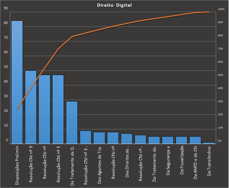 Em Direito Digital, nos baseamos neste caderno, contendo 316 questões. Aqui não utilizamos filtro da banca, pois sua inclusão resultaria em quantidade reduzida de questões. Veja como ficou a distribuição.