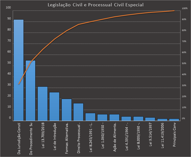 Para Legislação Civil e Processual Civil Especial, nos baseamos neste caderno, contendo 274 questões. Usamos como filtro questões elaboradas pela FGV em concursos para autoridades da área jurídica e servidores da área judiciária. Veja o resultado.