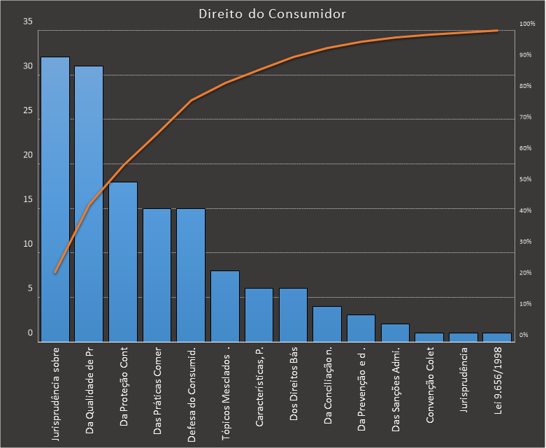 O caderno base contou com 143 questões. Usamos como filtro questões elaboradas pela FGV em concursos para autoridades da área jurídica e servidores da área judiciária. Jurisprudência sobre o código do consumidor é o assunto mais cobrado e representa 22% das questões.