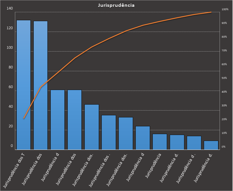 Em Jurisprudência, nos baseamos neste caderno, contendo 577 questões. Usamos como filtro questões elaboradas pela FGV em concursos para autoridades da área jurídica e servidores da área judiciária. Veja como ficou a distribuição.