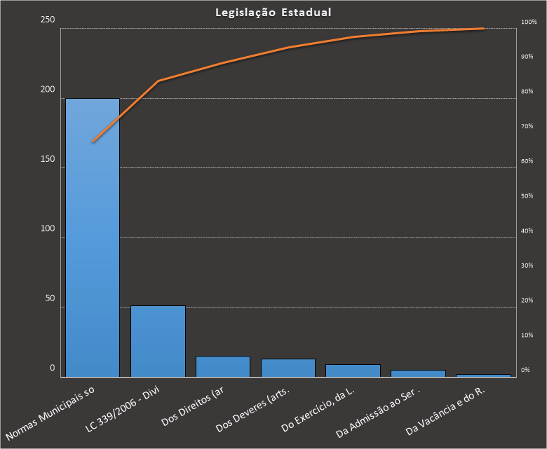 Em Legislação Estadual, nos baseamos neste caderno, contendo 295 questões. Aqui não utilizamos filtro da banca, pois sua inclusão resultaria em quantidade reduzida de questões. Veja como ficou a distribuição.