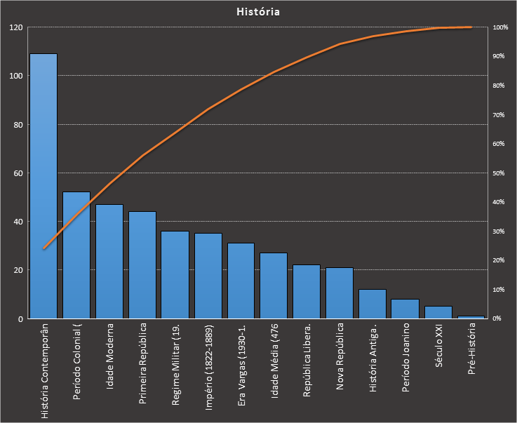 Em História, nos baseamos neste caderno, contendo 450 questões. Usamos como filtros questões de concursos de nível superior elaboradas pela VUNESP. Veja como ficou a distribuição.