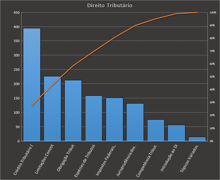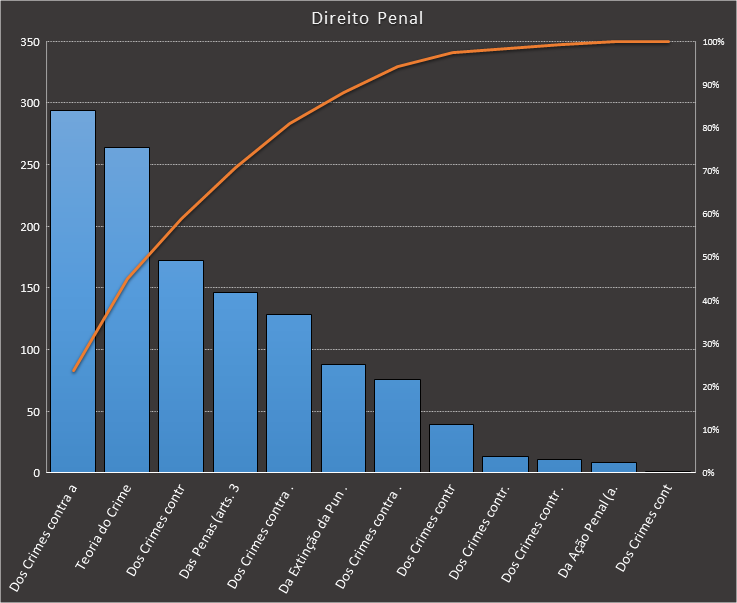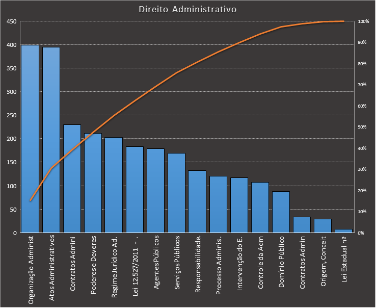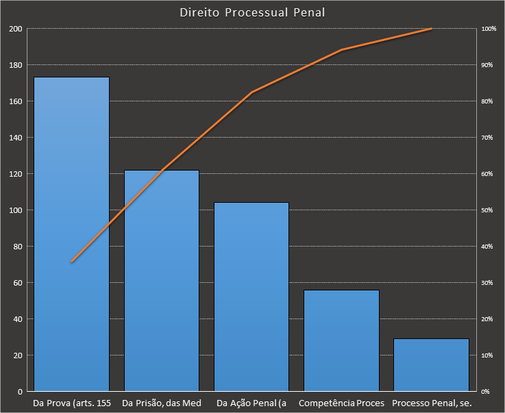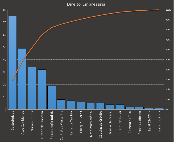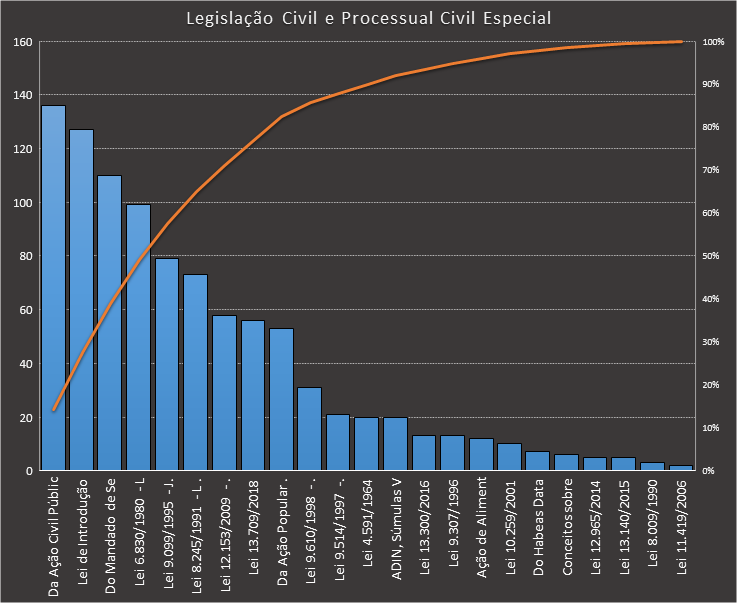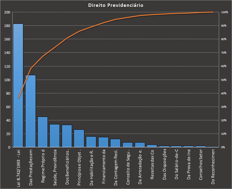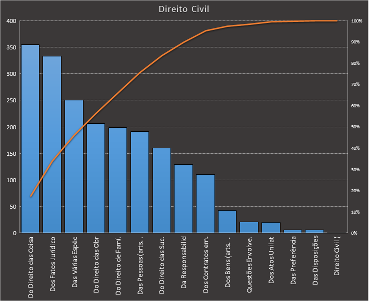 Em todas as tabelas deste artigo destacamos de cor azul os assuntos que atingem porcentagem acumulada de 70%. Para esta matéria em específico, temos destacados de azul 5 tópicos cuja porcentagem acumulada é de 76%. Isso significa que apenas 5 assuntos cobrem 76% de todas as questões da matéria que obedecem aos filtros utilizados. Segue a distribuição.