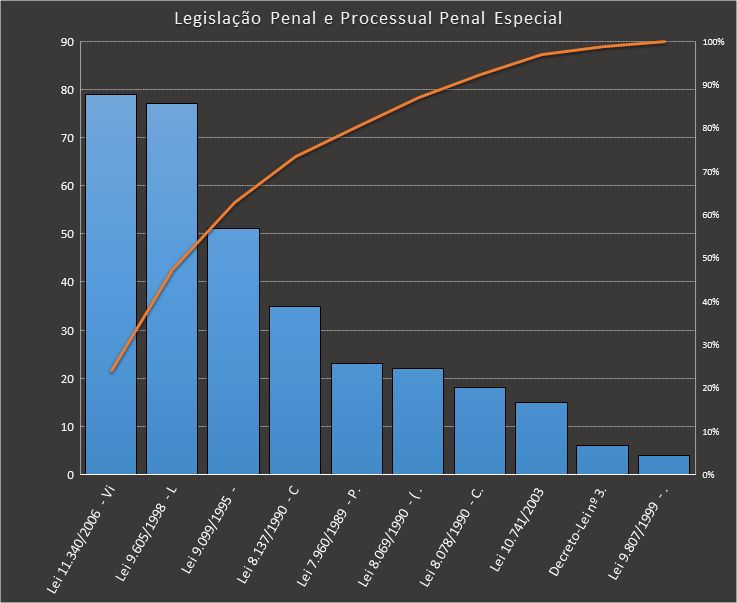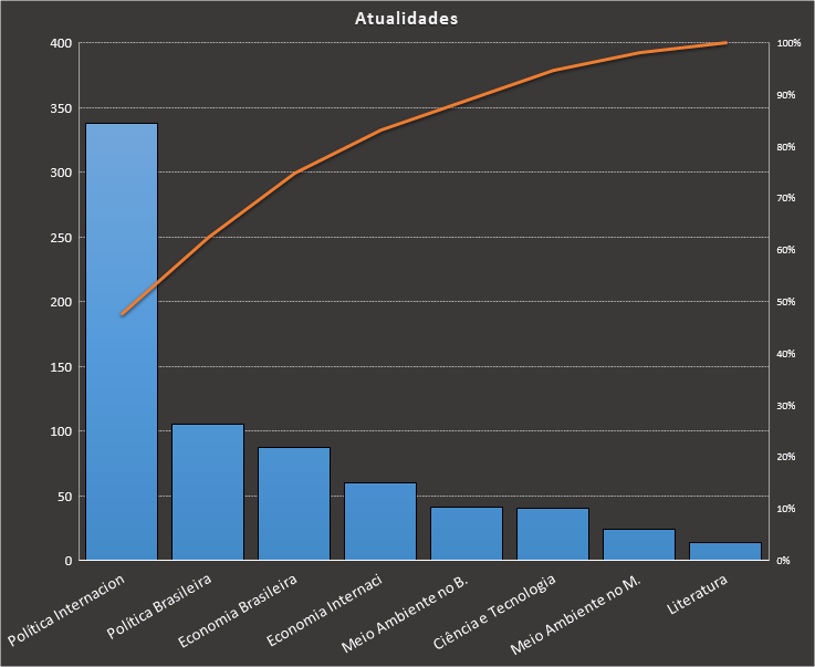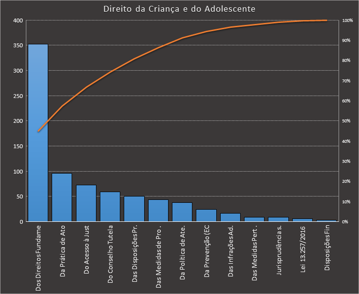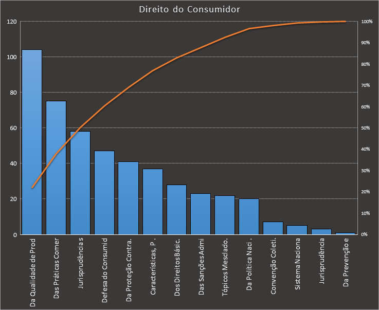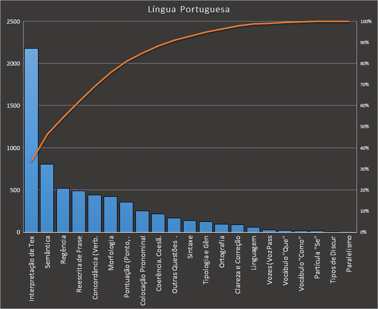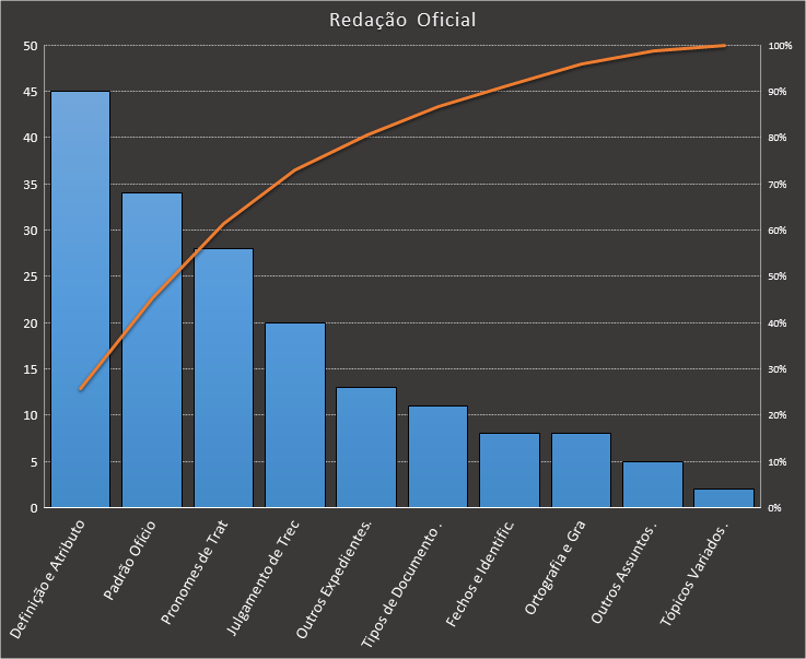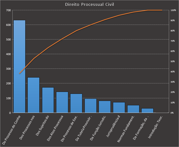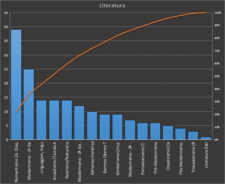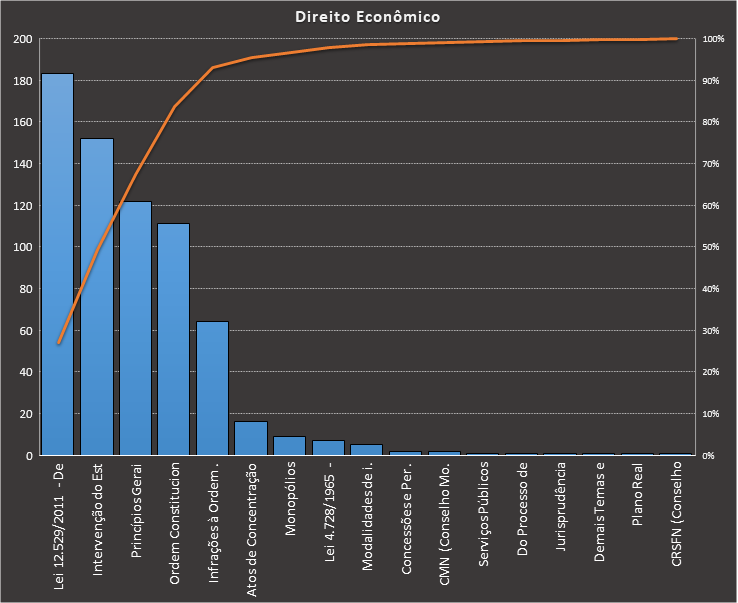 Em todas as tabelas deste artigo destacamos de cor azul os assuntos que atingem porcentagem acumulada de 70%. Para esta matéria em específico, temos destacados de azul 5 tópicos cuja porcentagem acumulada é de 76%. Isso significa que apenas 5 assuntos cobrem 76% de todas as questões da matéria que obedecem aos filtros utilizados. Segue a distribuição.