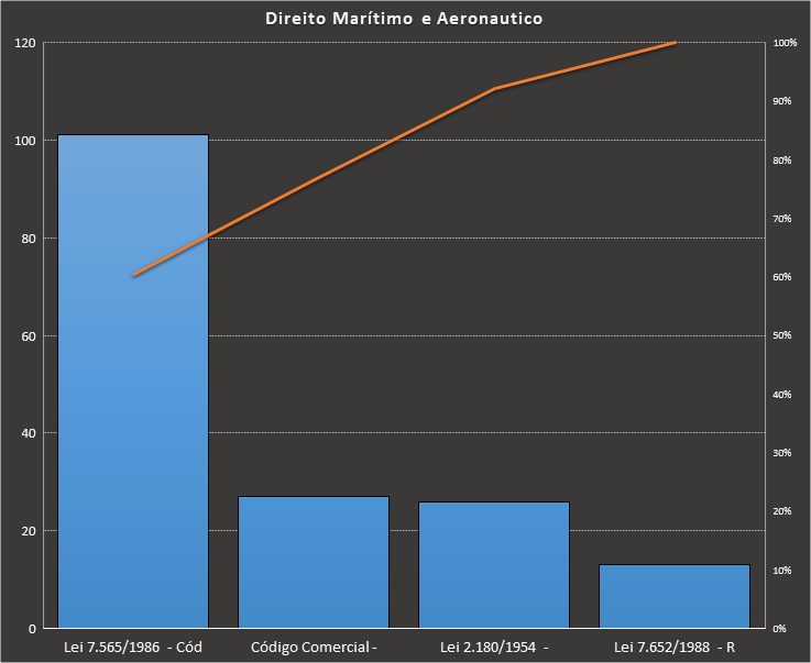 Em Direito Marítimo e Aeronautico, nos baseamos neste caderno, contendo 167 questões. Usamos como filtros questões de concursos de nível superior elaboradas pela VUNESP. Veja como ficou a distribuição.