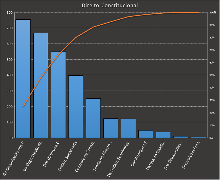 Em Direito Constitucional, nos baseamos neste caderno, contendo 2.963 questões. Usamos como filtros questões de concursos de nível superior elaboradas pela VUNESP. Um quarto das questões cobram sobre organização dos poderes. Incluindo também as questões sobre organização do Estado, temos dois assuntos cobrindo praticamente 50% das questões.
