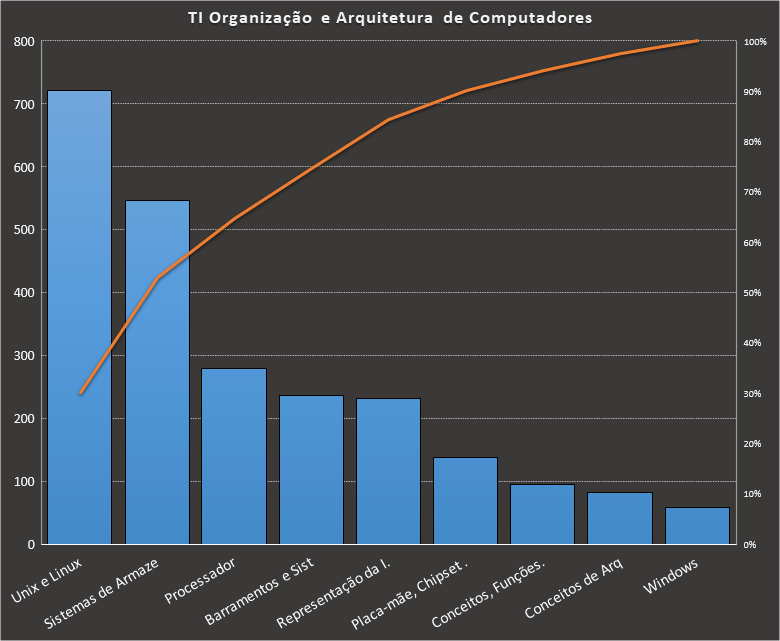 Em TI Organização e Arquitetura de Computadores, nos baseamos neste caderno, contendo 2.390 questões. Usamos como filtro questões de concursos para servidores da área judiciária. Veja como ficou a distribuição.