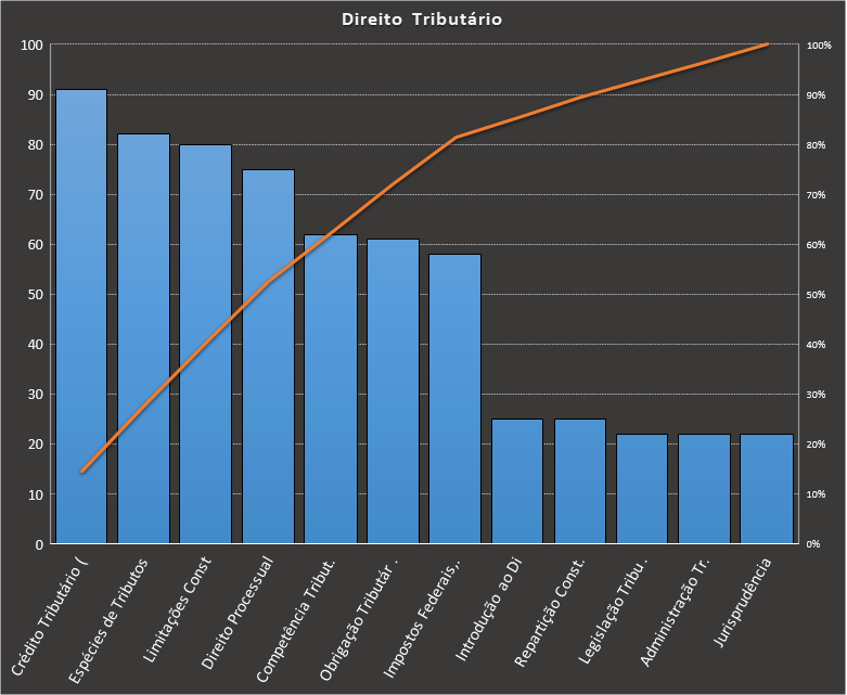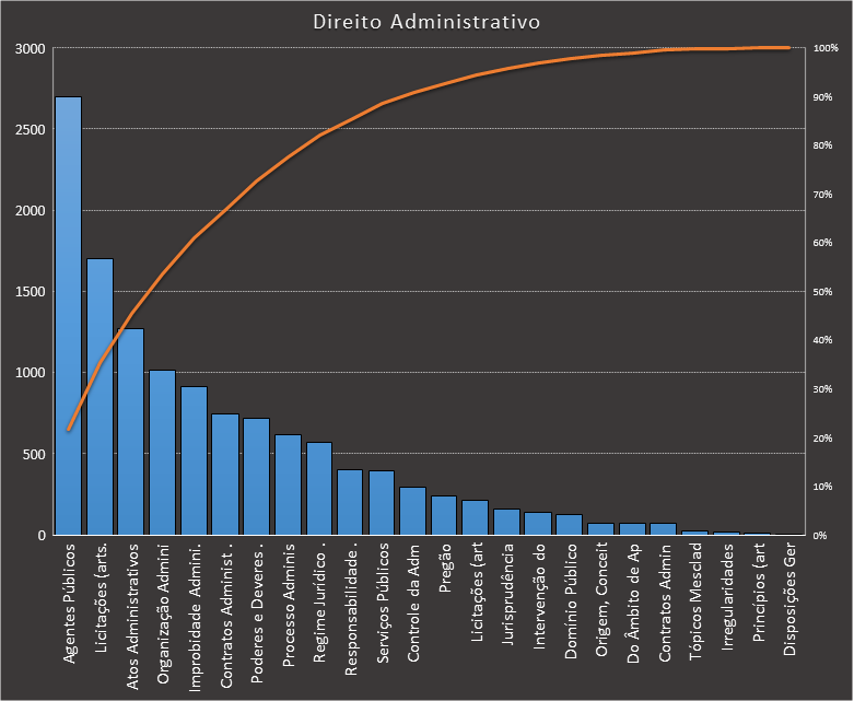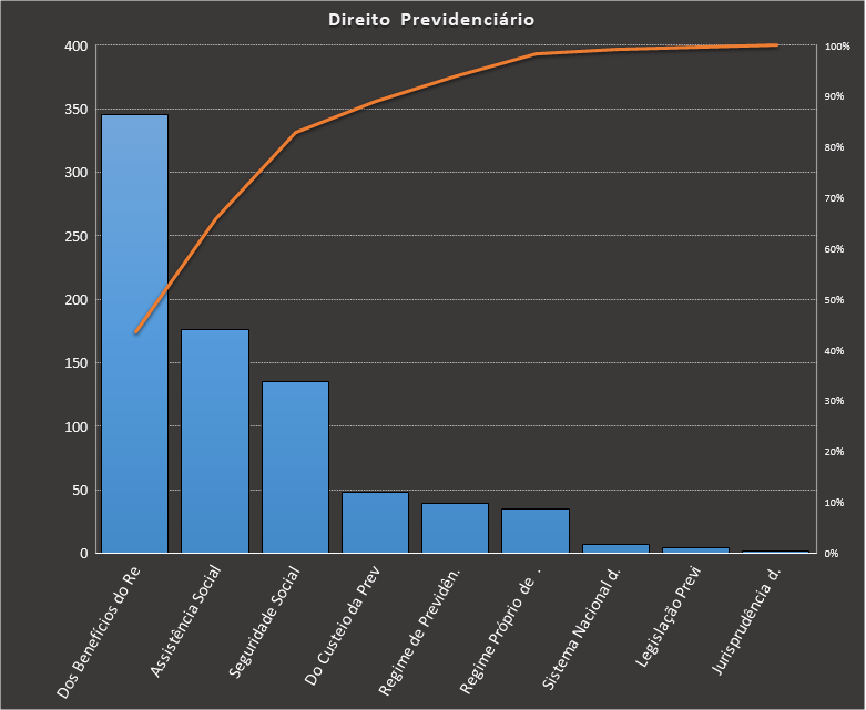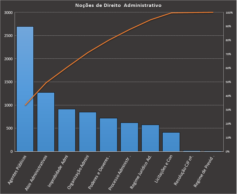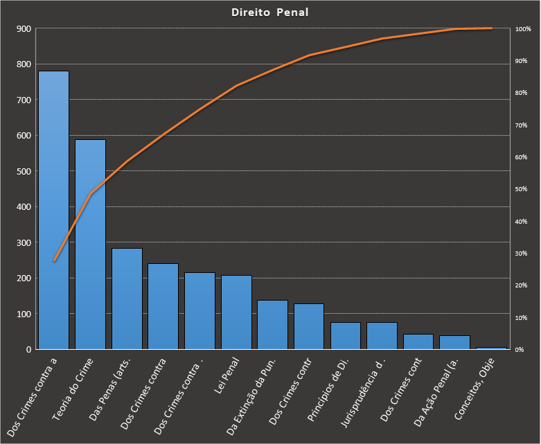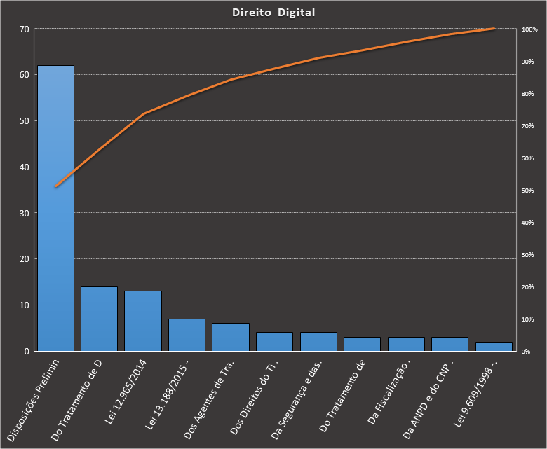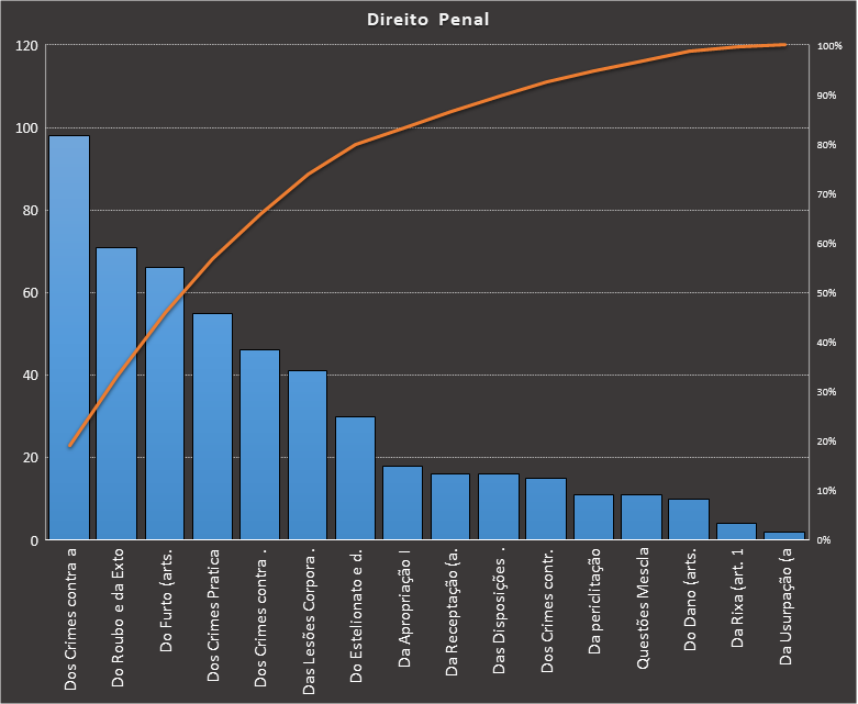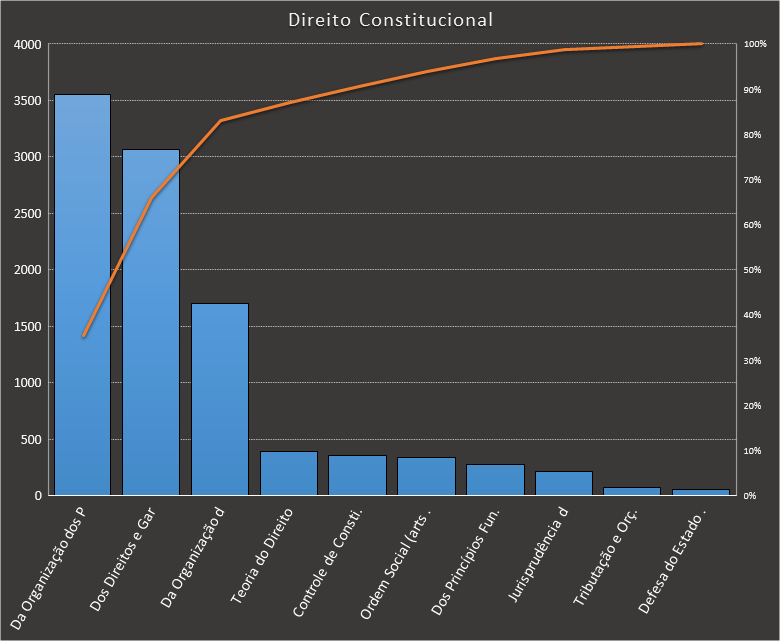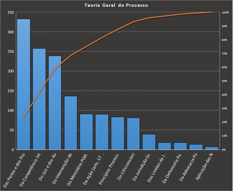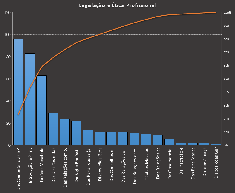Em todas as tabelas deste artigo destacamos de cor azul os assuntos que atingem porcentagem acumulada de 70%. Para esta matéria em específico, temos destacados de azul 7 tópicos cuja porcentagem acumulada é de extamente 70%. Isso significa que 7 assuntos cobrem 70% de todas as questões da matéria que obedecem aos filtros utilizados. Segue a distribuição.