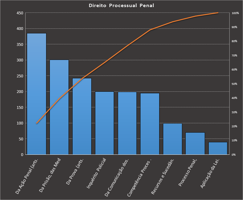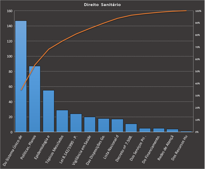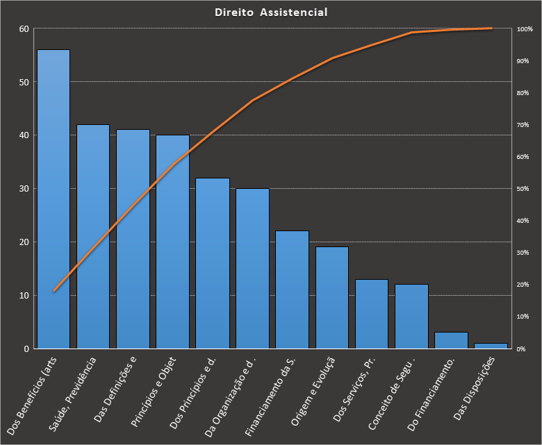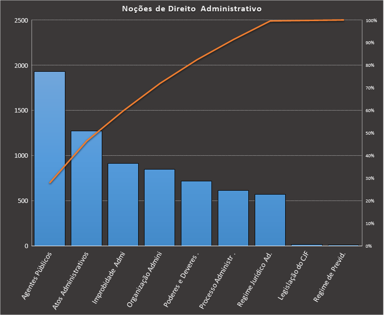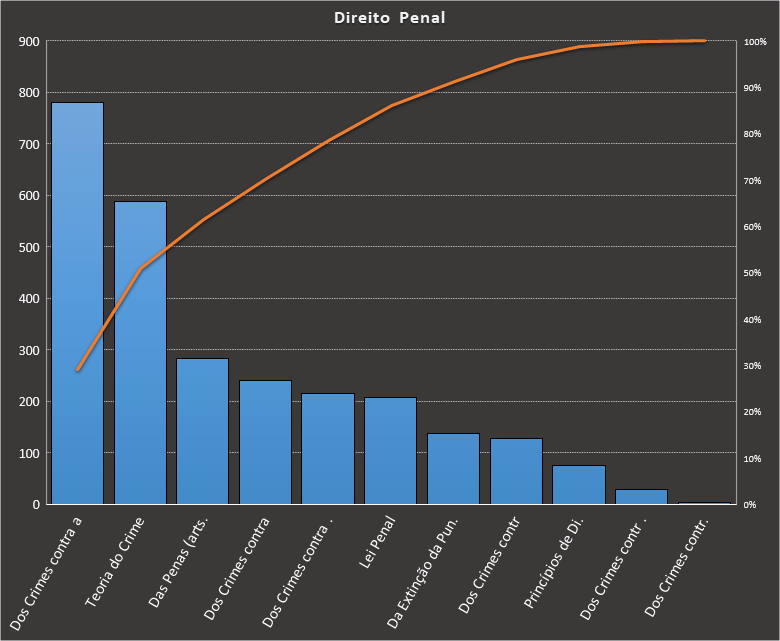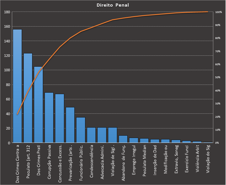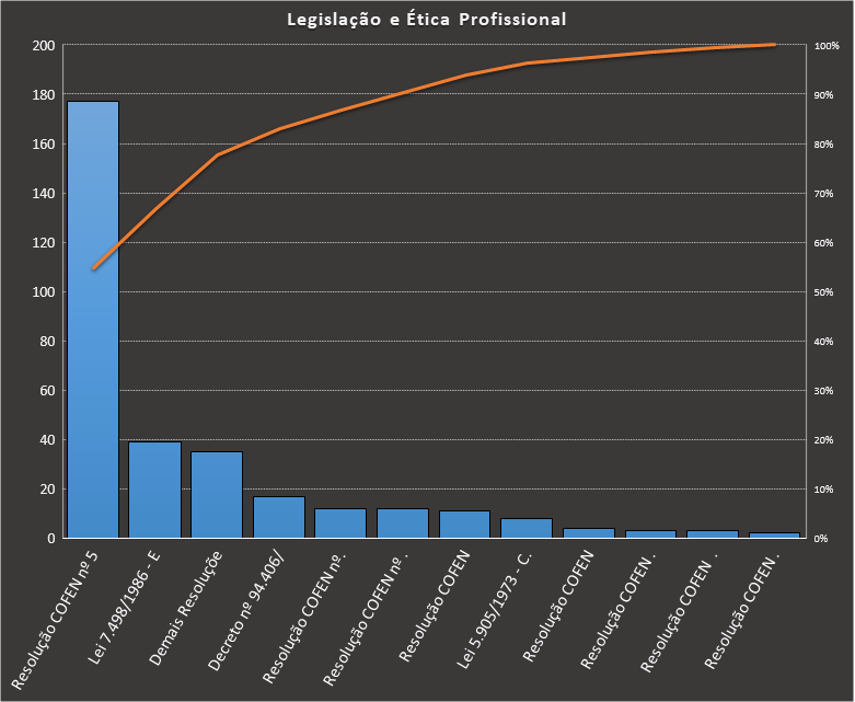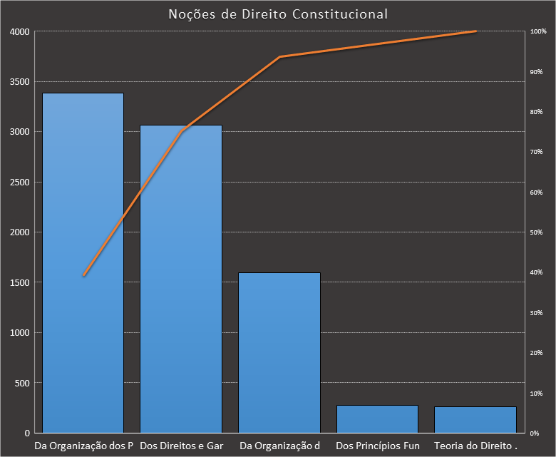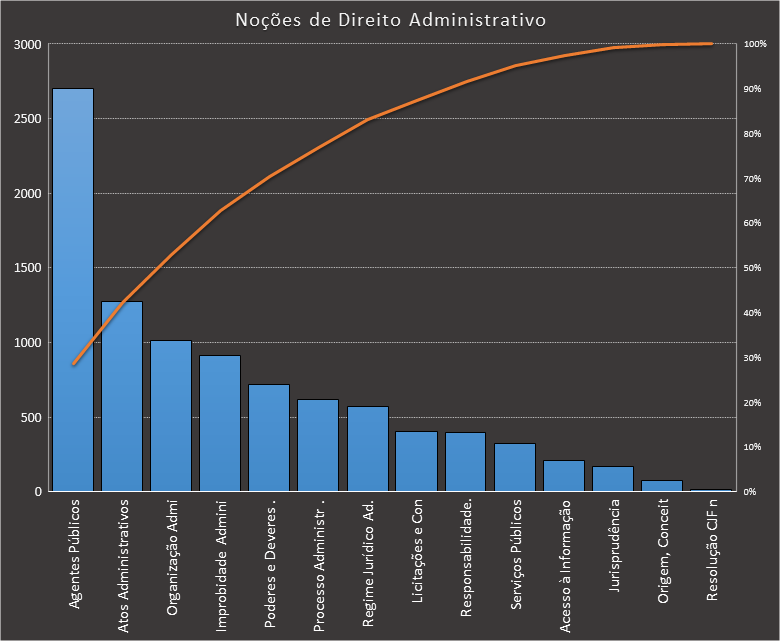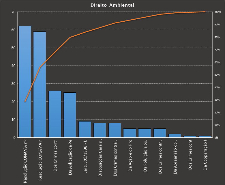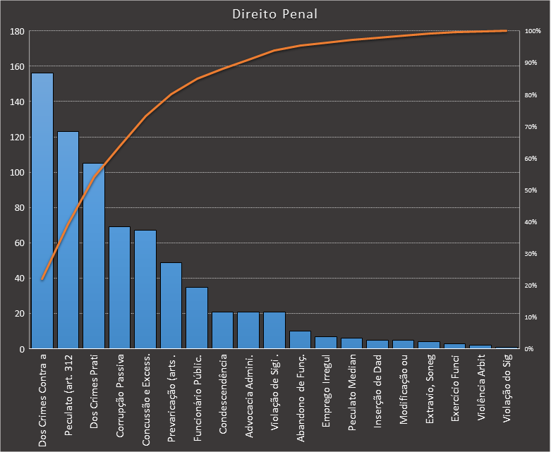 Em todas as tabelas deste artigo destacamos de cor azul os assuntos que atingem porcentagem acumulada de 70%. Para esta matéria em específico, temos destacados de azul 7 tópicos cuja porcentagem acumulada é de extamente 70%. Isso significa que 7 assuntos cobrem 70% de todas as questões da matéria que obedecem aos filtros utilizados. Segue a distribuição.