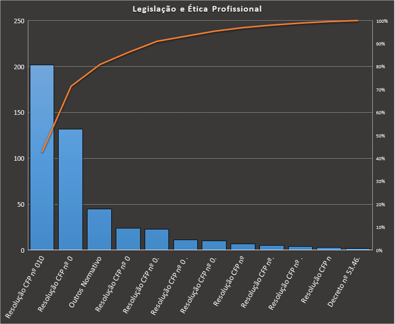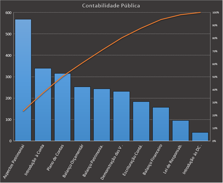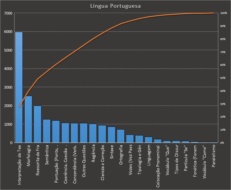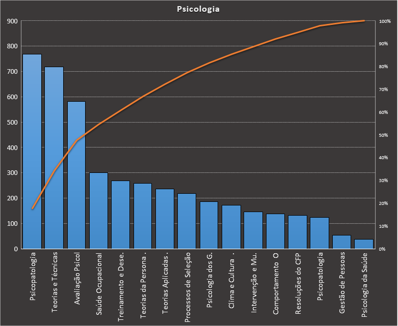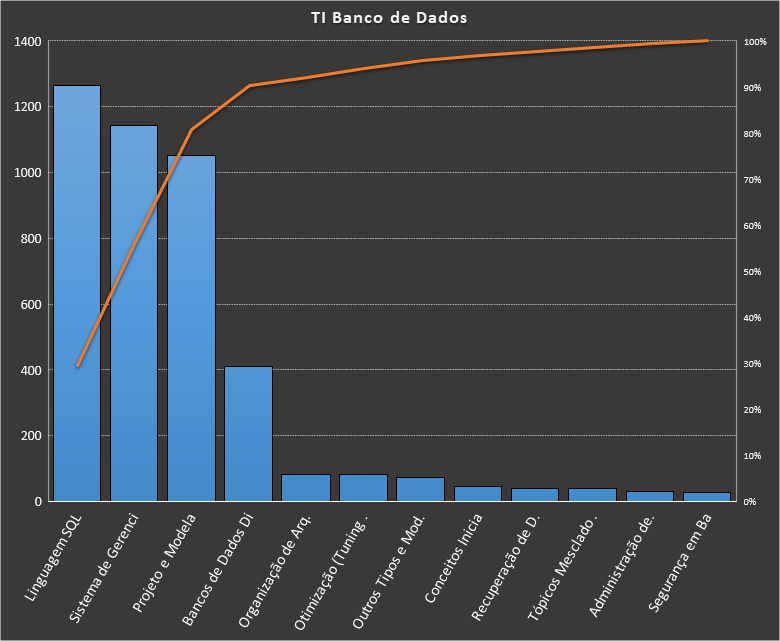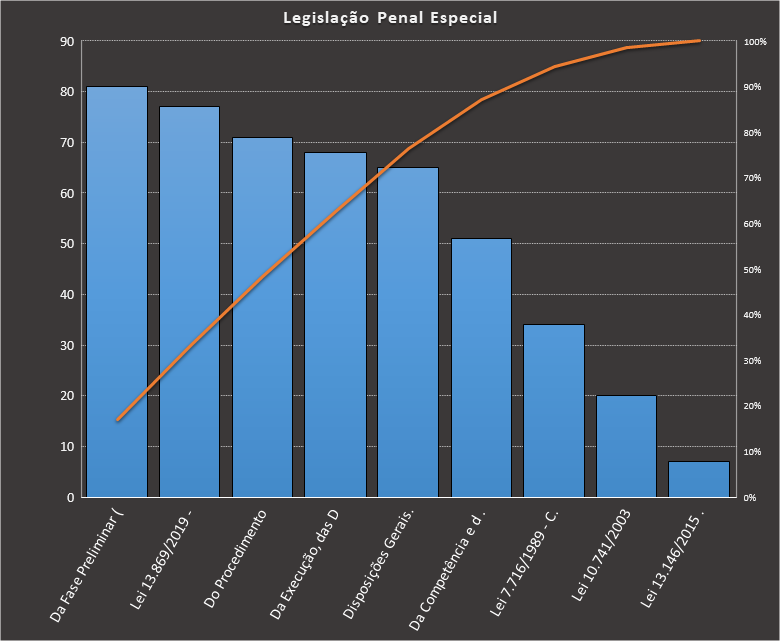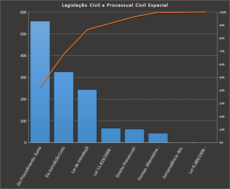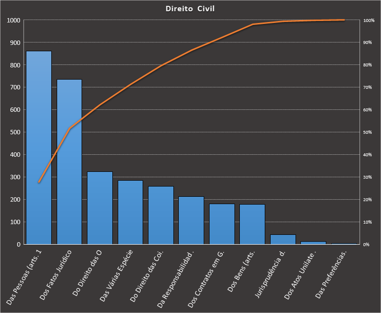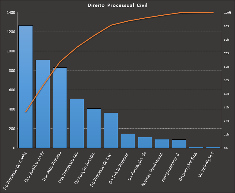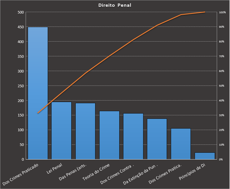 Em todas as tabelas deste artigo destacamos de cor azul os assuntos que atingem porcentagem acumulada de 70%. Para esta matéria em específico, temos destacados de azul 7 tópicos cuja porcentagem acumulada é de extamente 70%. Isso significa que 7 assuntos cobrem 70% de todas as questões da matéria que obedecem aos filtros utilizados. Segue a distribuição.