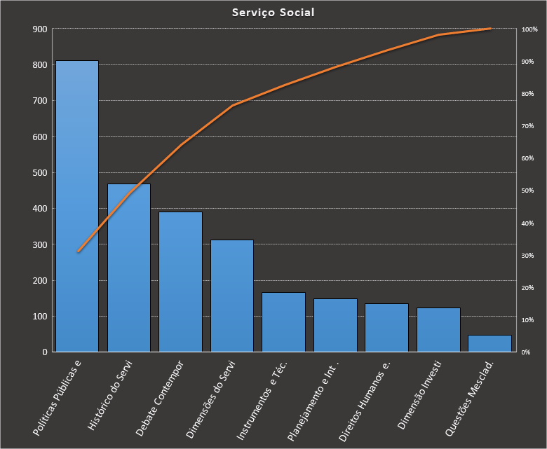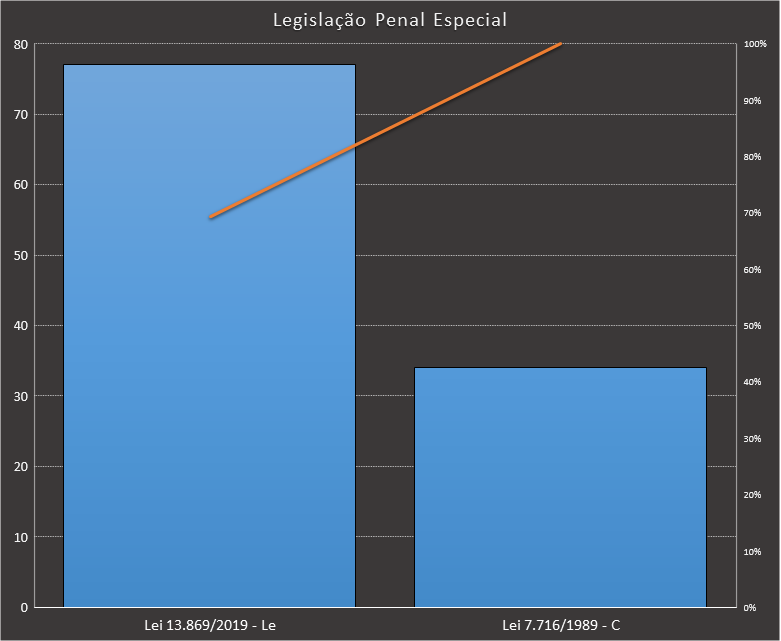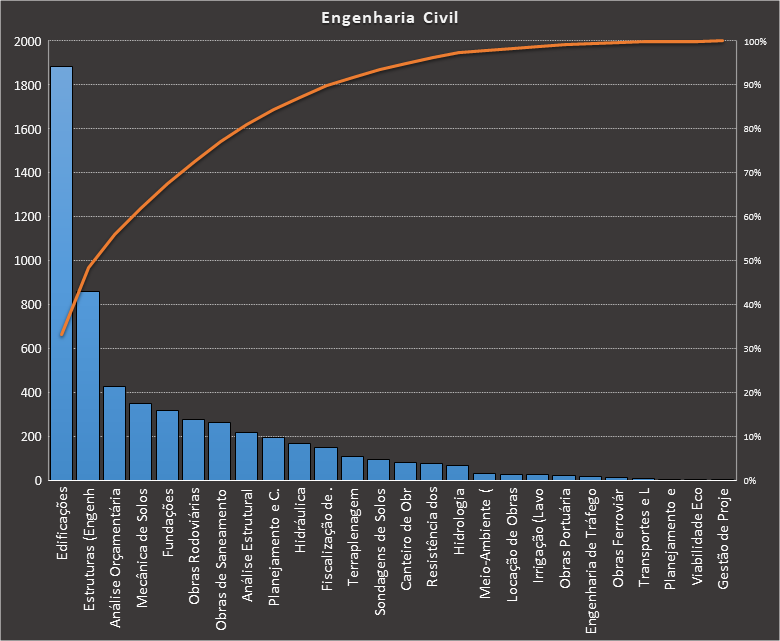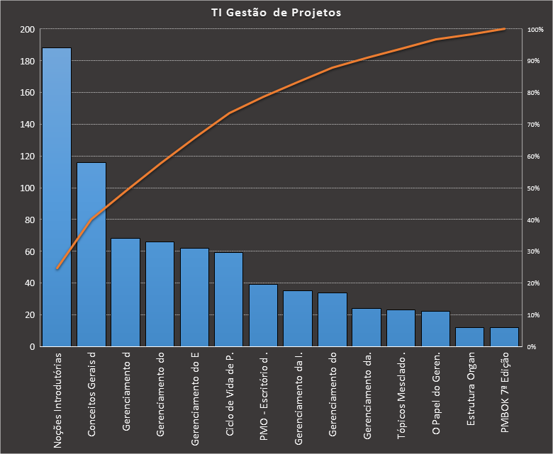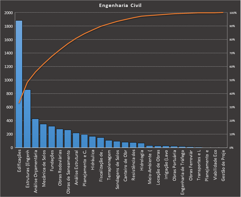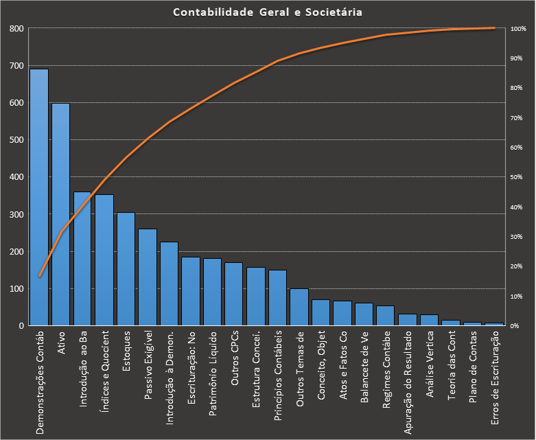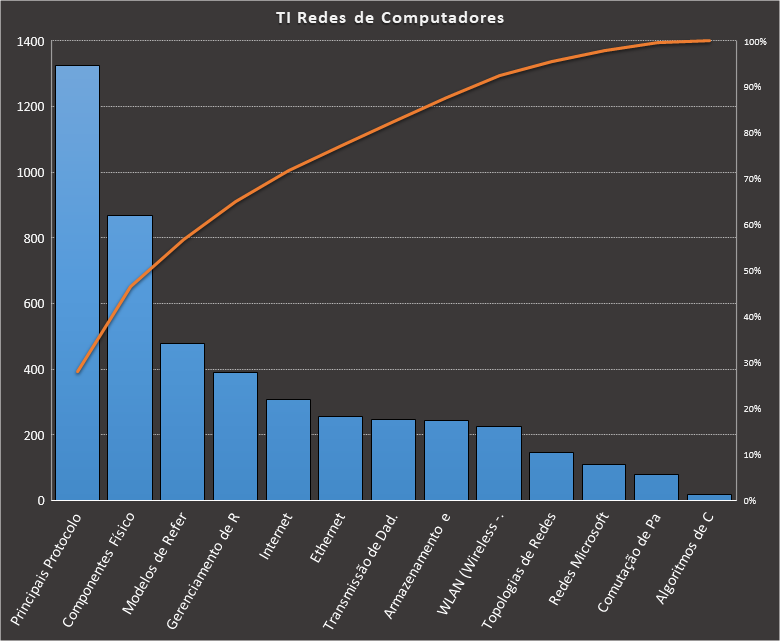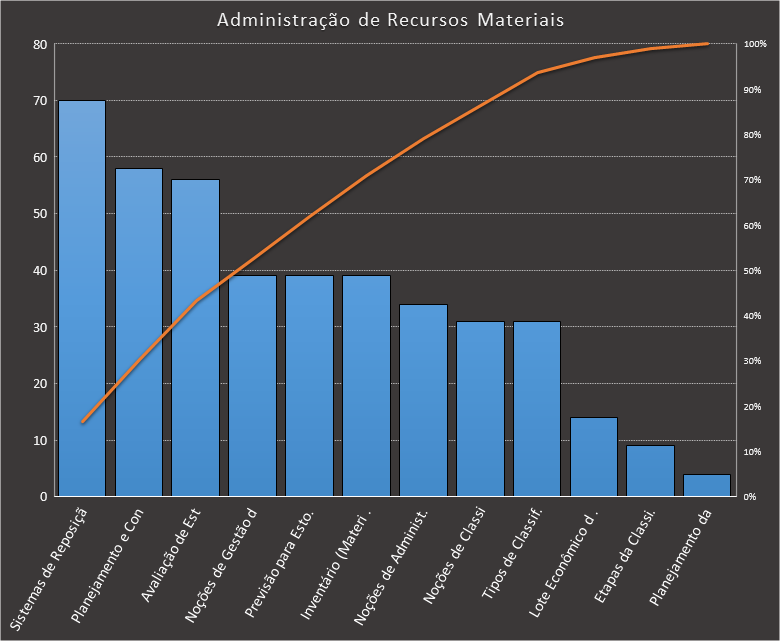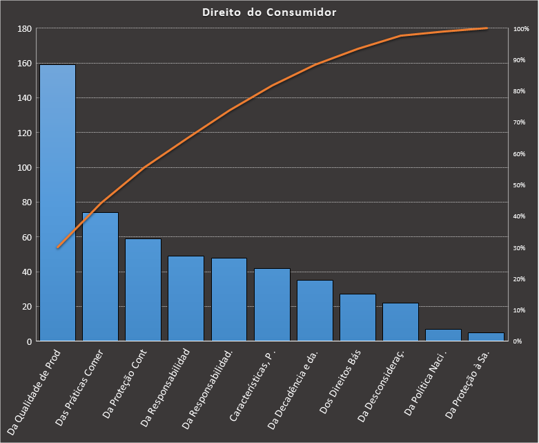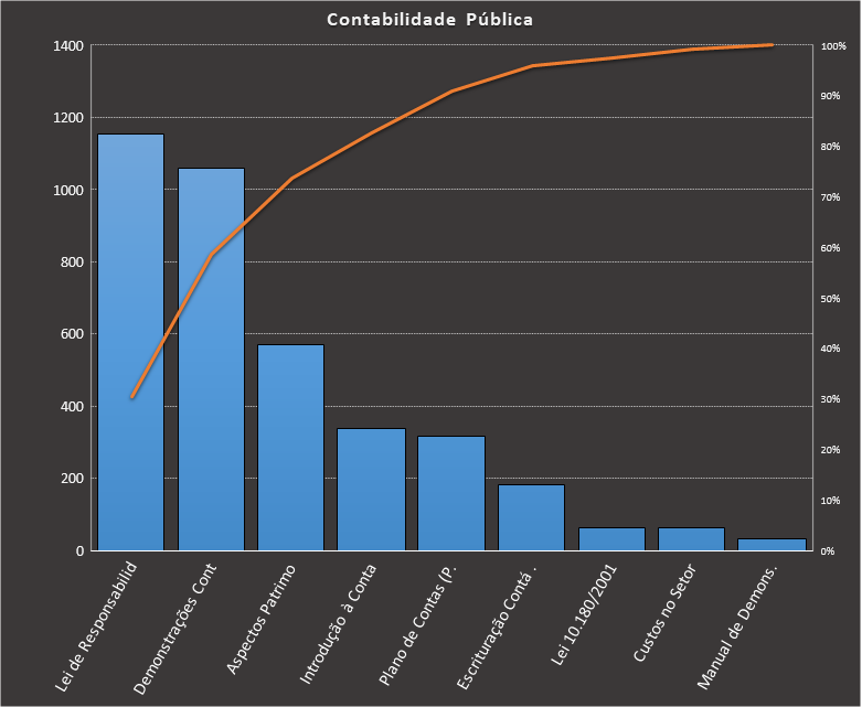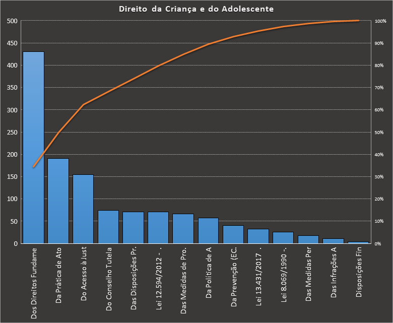 Em todas as tabelas deste artigo destacamos de cor azul os assuntos que atingem porcentagem acumulada de 70%. Para esta matéria em específico, temos destacados de azul 7 tópicos cuja porcentagem acumulada é de extamente 70%. Isso significa que 7 assuntos cobrem 70% de todas as questões da matéria que obedecem aos filtros utilizados. Segue a distribuição.