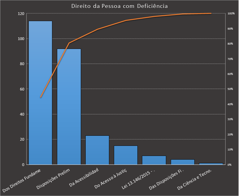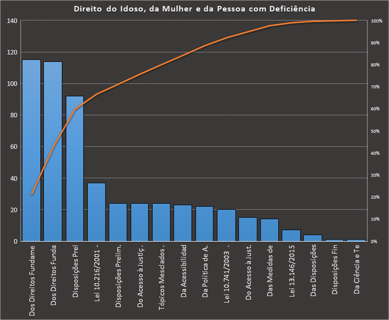 Para esta matéria nos baseamos neste caderno, contendo 418 questões. Usamos como filtro questões de concursos para servidores da área judiciária. Estatuto da Pesso com Deficiência representa 60% das questões. A distribuição abaixo não mostra, mas, dentro desse tópico, o subtópico mais cobrado é "disposições preliminares (artigos 1 a 9 da Lei no 13.146/2015)", representando 22% de todas as questões. Veja a distribuição: