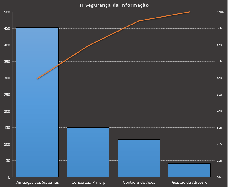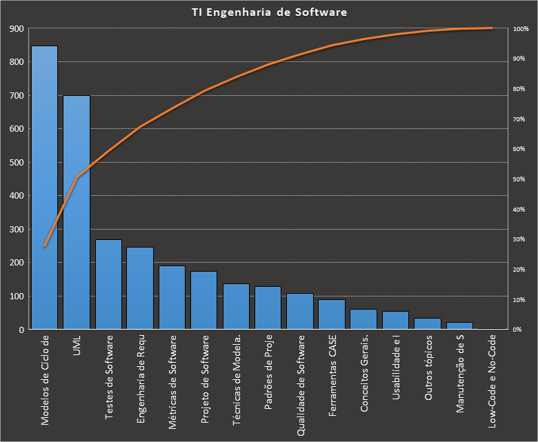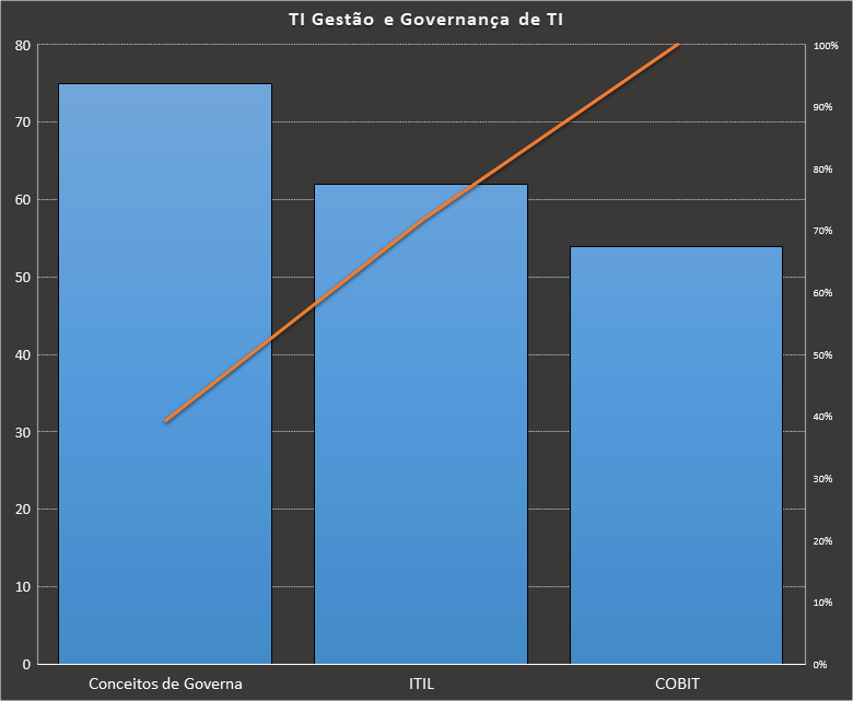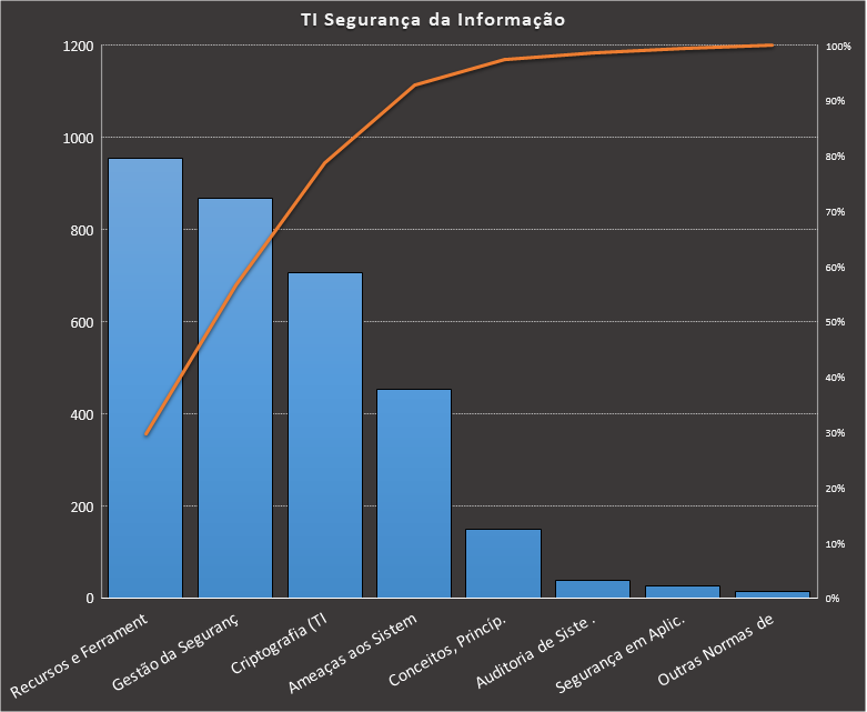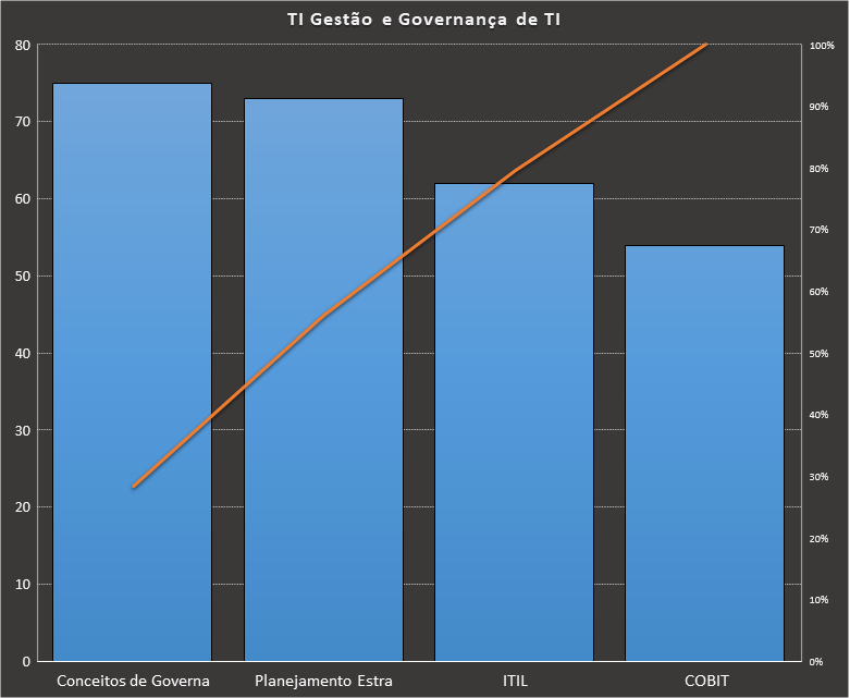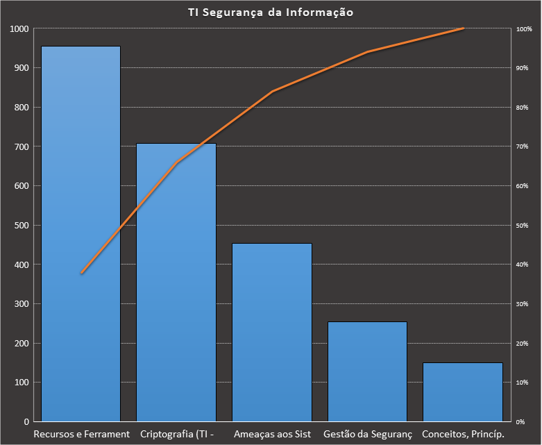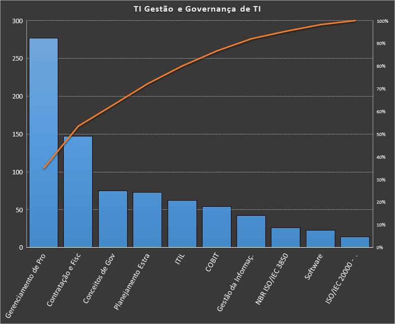 Em TI Gestão e Governança de TI, nos baseamos neste caderno, contendo 191 questões. Usamos como filtro questões de concursos para servidores da área judiciária. Veja como ficou a distribuição.