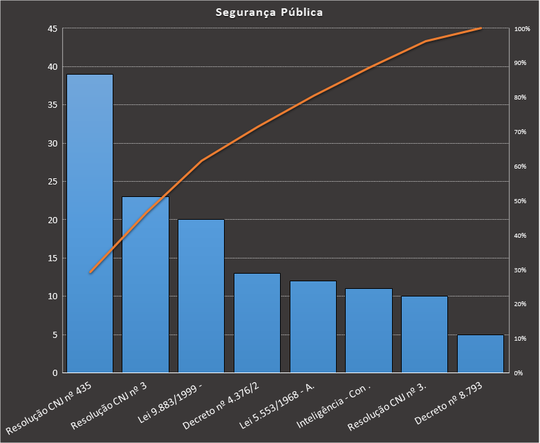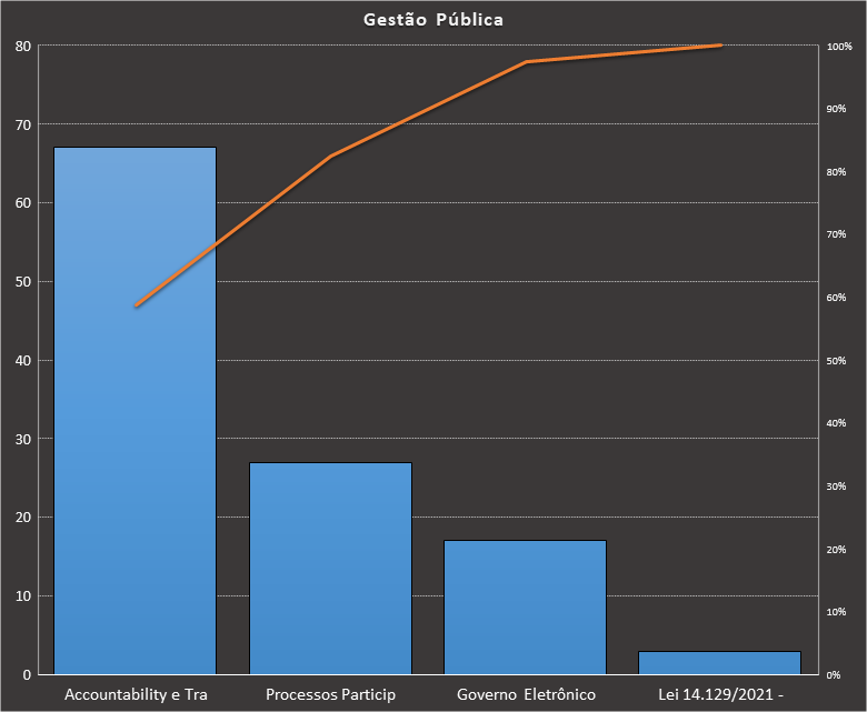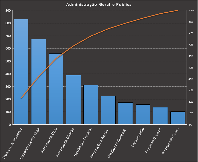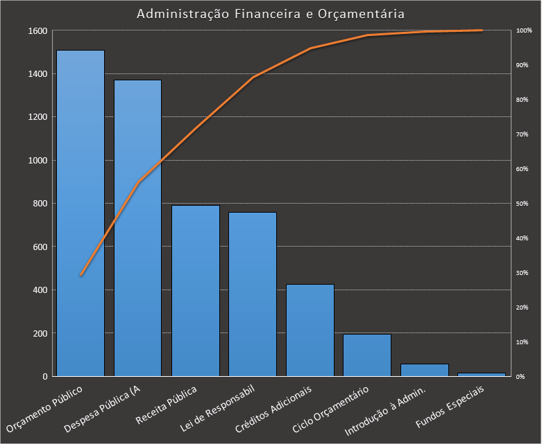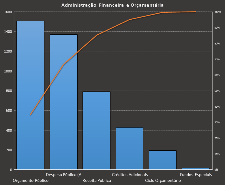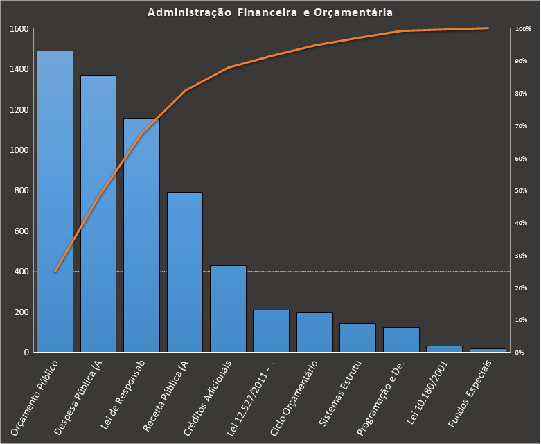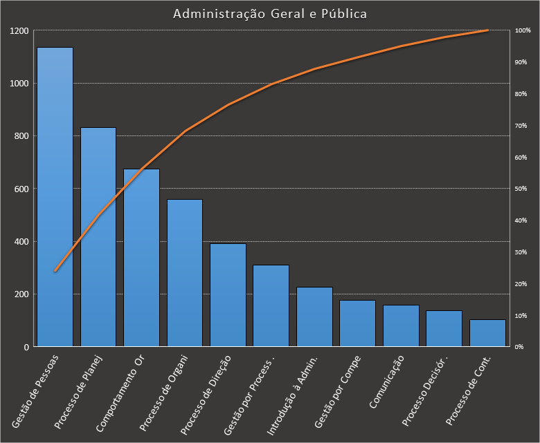 Em Gestão Pública, nos baseamos neste caderno, contendo 114 questões. Usamos como filtro questões de concursos para servidores da área judiciária. Veja como ficou a distribuição.